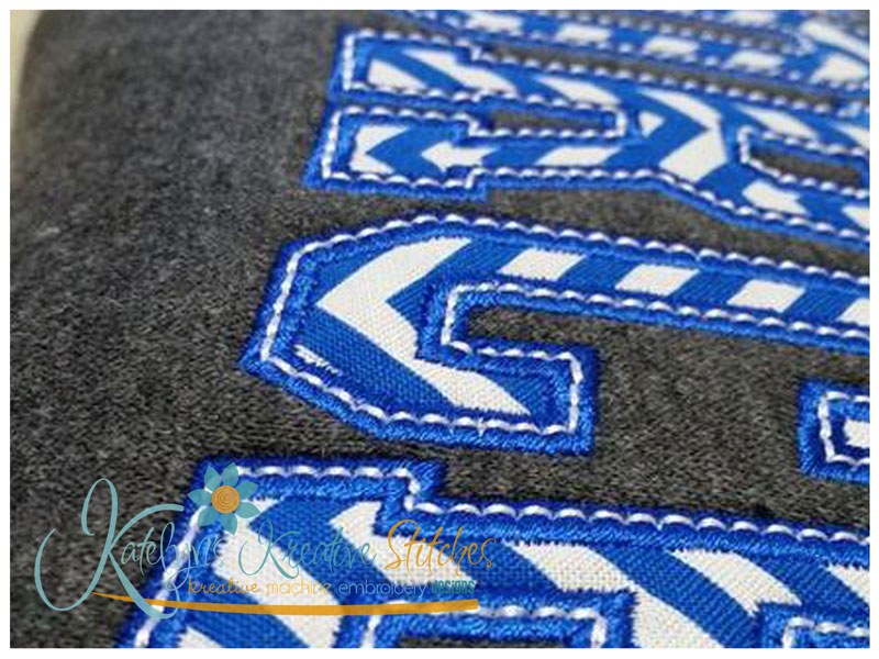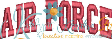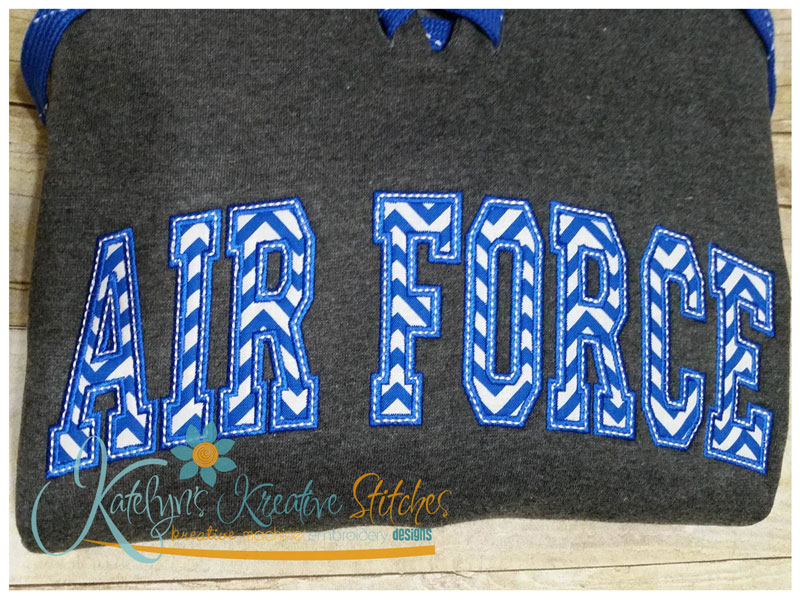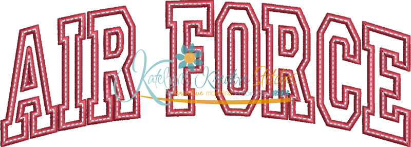 Our Arched Air Force design will come in 5 sizes.  The 5x7, 6x10, 8x12 and 8x14 will be applique.  The smaller 4x4 size will be in a satin stitch.  These will be great for school sweatshirts and tees.  The 4x4 size will be perfect for polo's too.