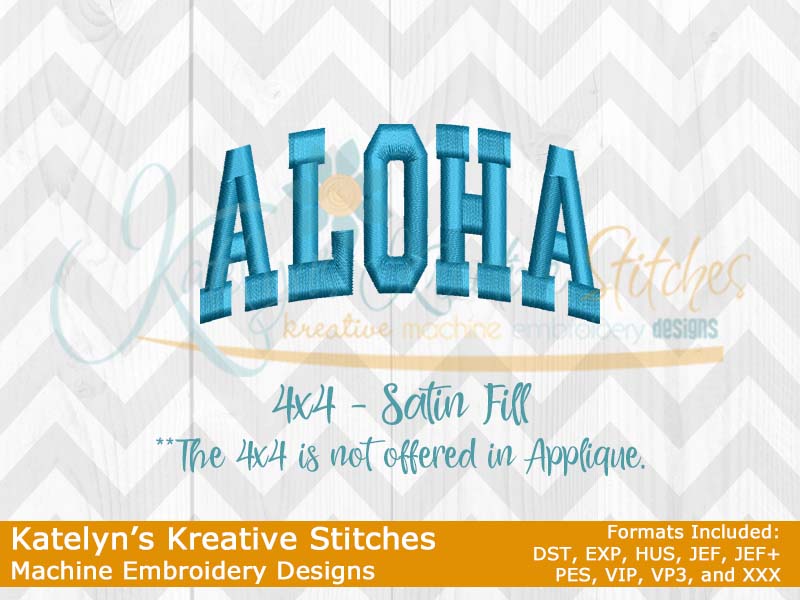 Our Arched designs will come in 5 sizes. The 5x7, 6x10, 8x12 and 8x14 will be applique. The smaller 4x4 size will be in a satin stitch. These will be great for sweatshirts and tees. The 4x4 size will be perfect for polo's too.