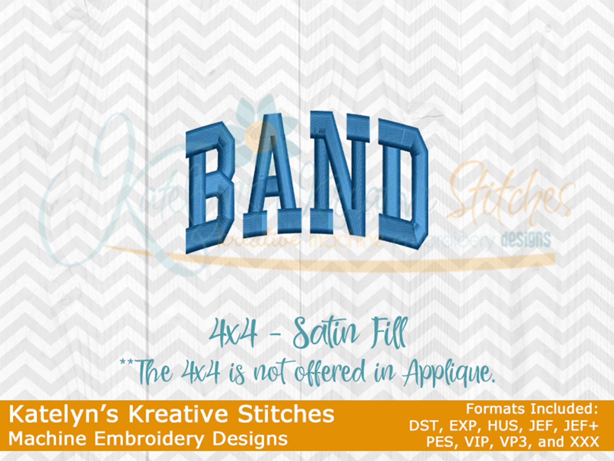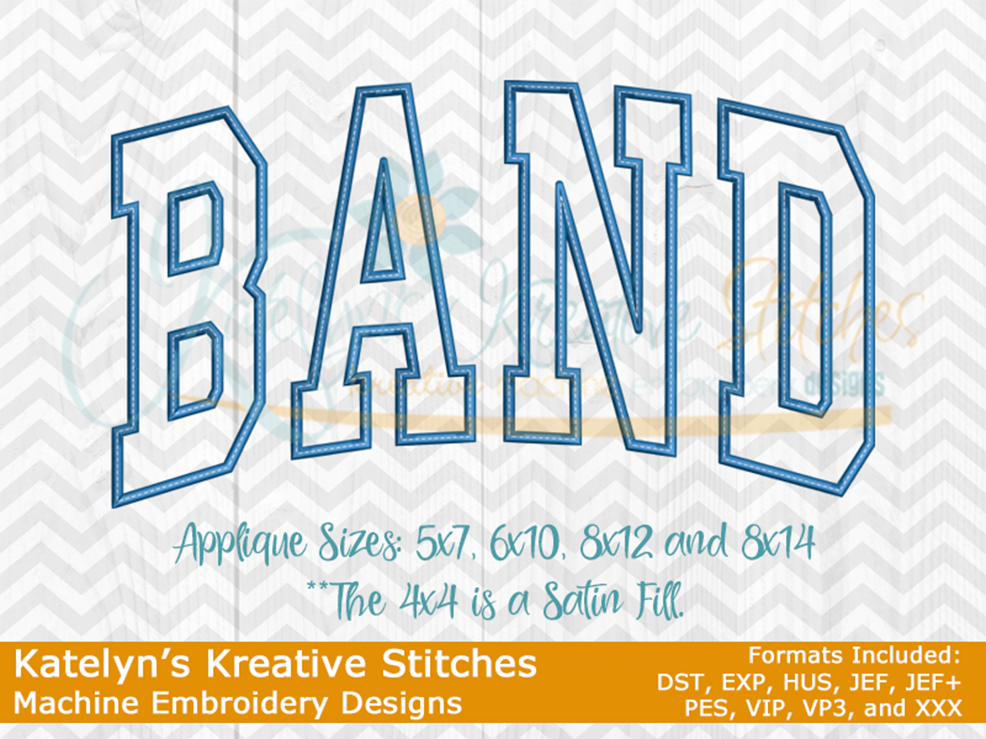 Our Band arched embroidery design will come in 5 sizes. Â The 5x7, 6x10, 8x12 and 8x14 will be applique. Â The smaller 4x4 size will be in a satin stitch. Â These will be great for school sweatshirts and tees. Â The 4x4 size will be perfect for polo's too.