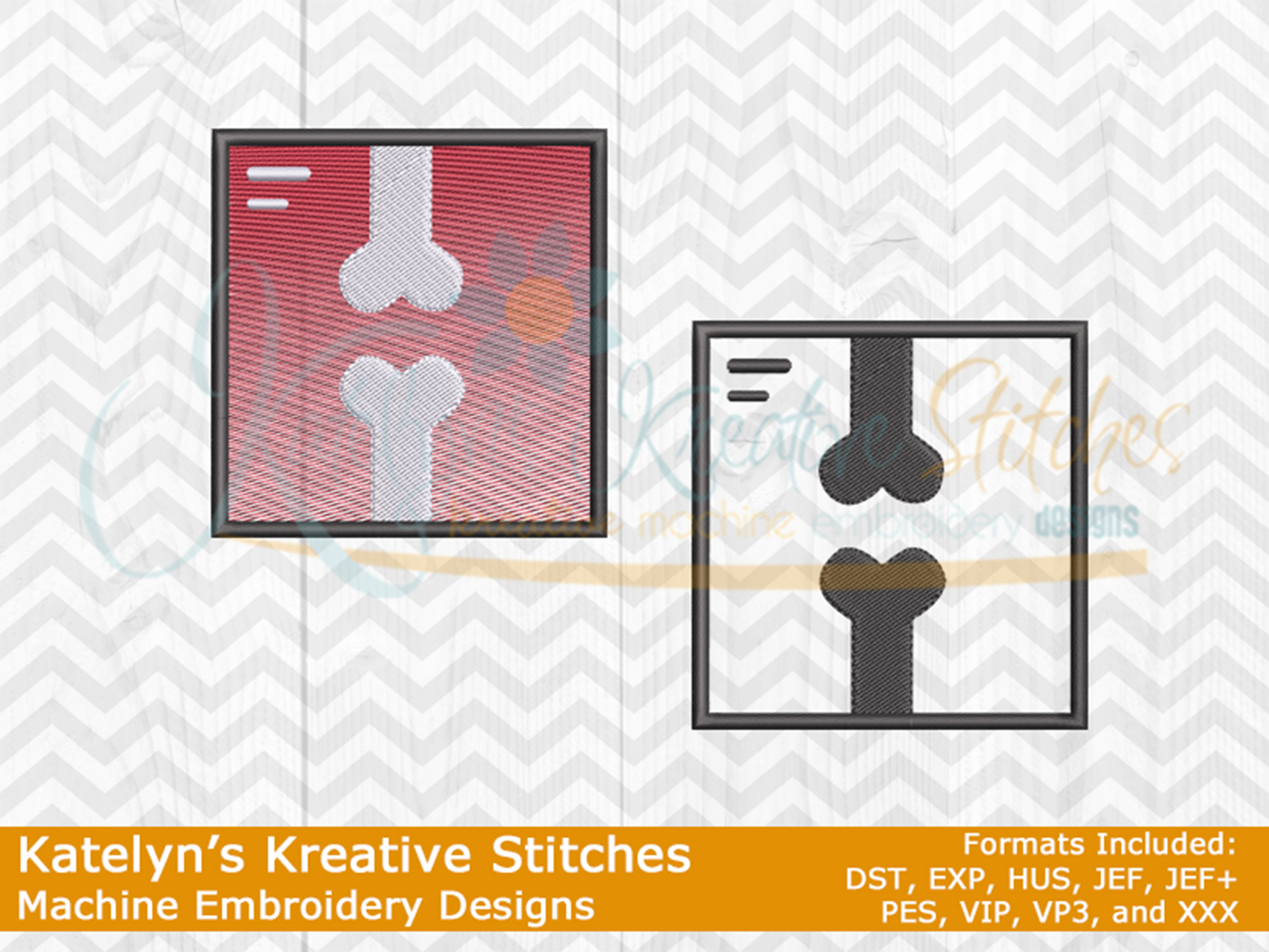 Our Bones XRay embroidery design will come in both a filled and outline version. One will be a mutli colored fill stitch and the other will be a single colored satin outline. This design will fit the 2x2, 3x3 and 4x4 hoop sizes. They can be mixed and matched to create your own icon embroidery designs, like our XRay Tech Life design. They are also great for monogrammed jackets, sweatshirts, tees, hoodies, blankets, towels and totes.