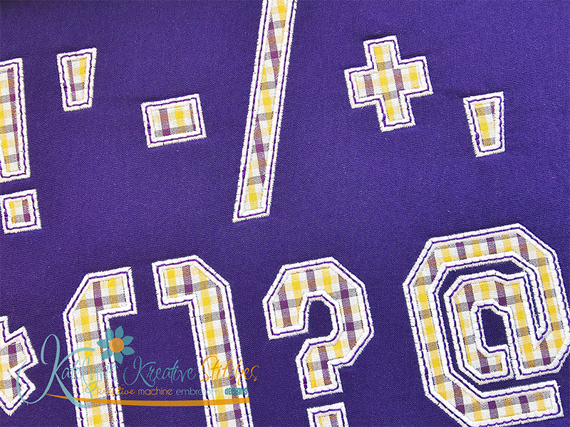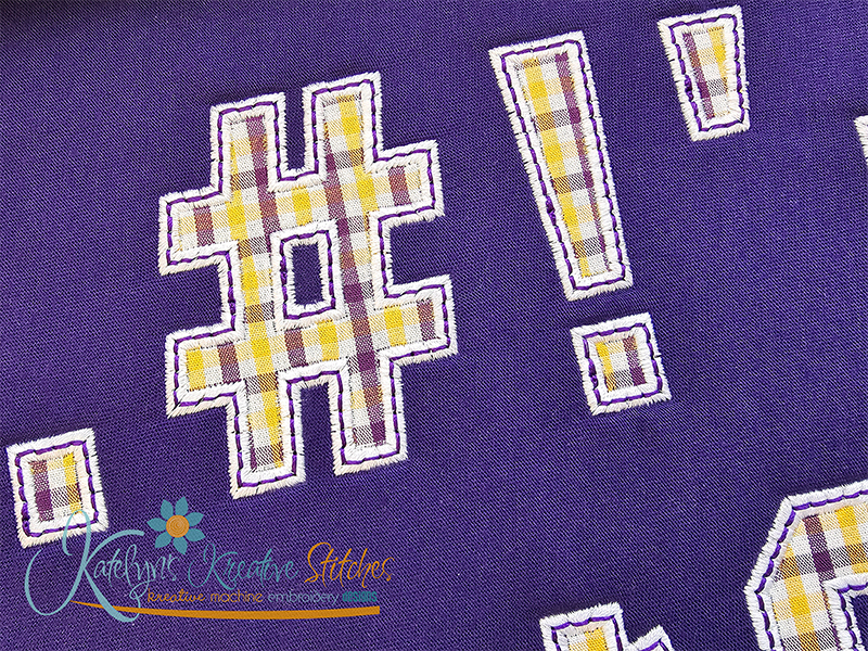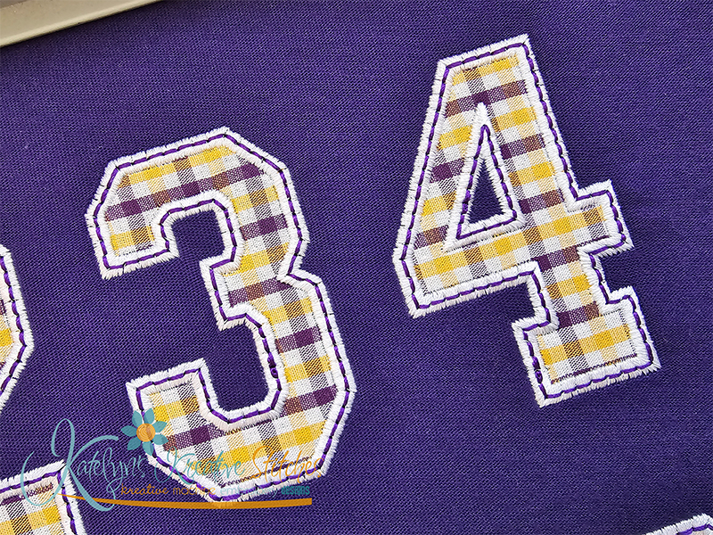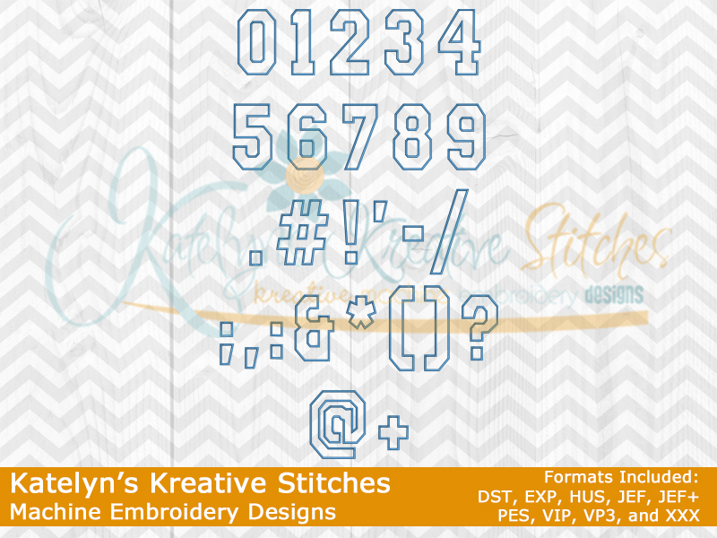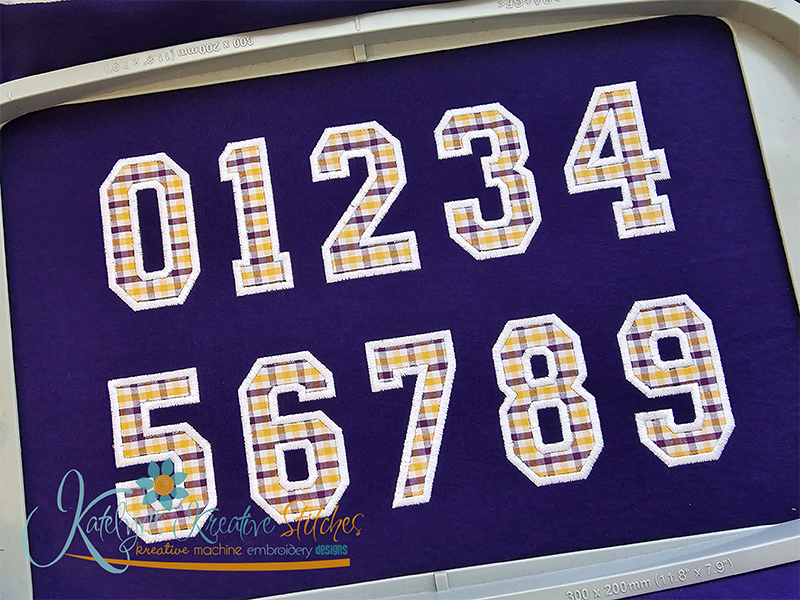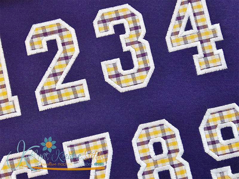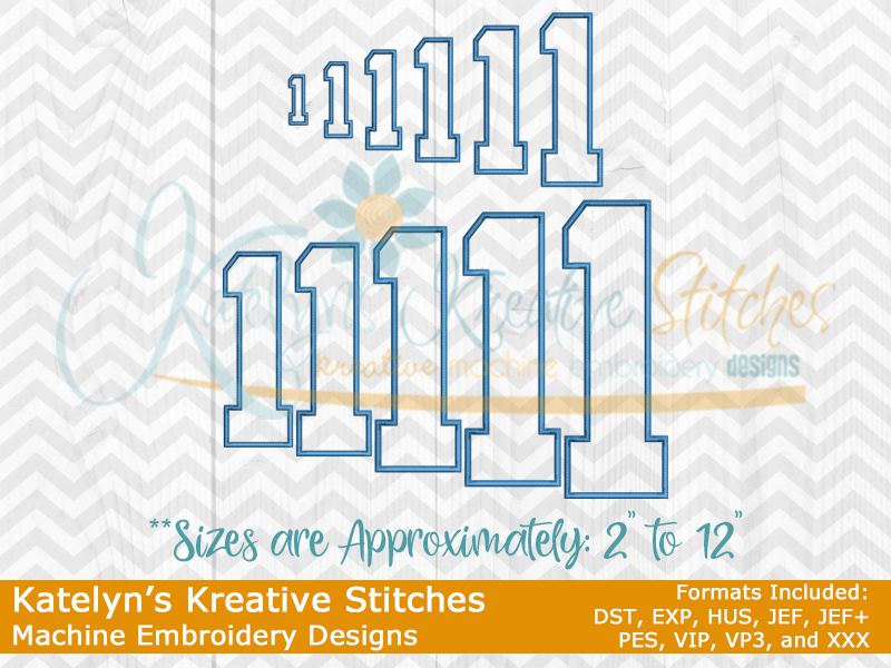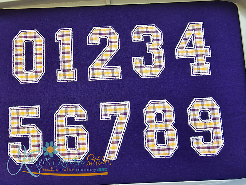 Our College Applique Number Set will include the 2, 3, 4, 5, 6, 7, 8, 9, 10, 11 and 12 inch sizes. Please keep in mind that our numbers and special characters are manually digitized in proportion with each other. So the sizes are approximate. You'll receive all numbers 0-9 and special characters. This applique number set is done with a wide satin stitch and a optional triple stitch (or bean stitch) on the top. These numbers are made to match all of our arched designs.