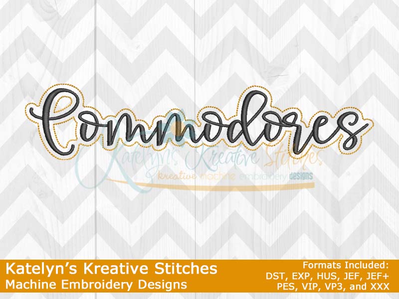 Our Commodores Script will come in 5 sizes for a quick and simple stitch out. They will fit the 4x4, 5x7, 6x10, 8x12 and 8x14 hoop sizes. These will be great for school tees, sweatshirts, hoodies, blankets, bags and much more. The 4x4 size will be perfect for polo's. Please refer to your .pdf files for design layout and color chart. Each step is labeled on the .pdf files.