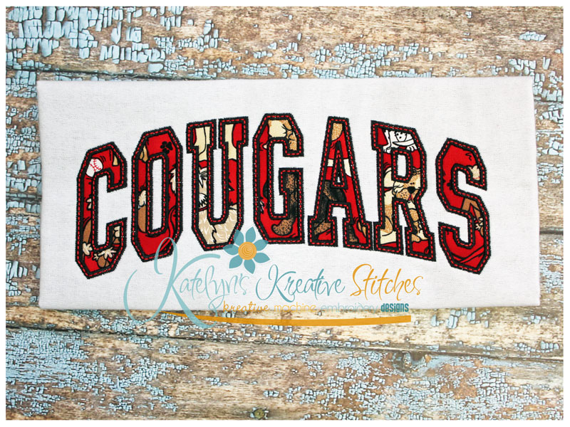 Our Arched Mascot designs will come in 5 sizes. The 5x7, 6x10, 8x12 and 8x14 will be applique. The smaller 4x4 size will be in a satin stitch. These will be great for school sweatshirts and tees. The 4x4 size will be perfect for polo's too.