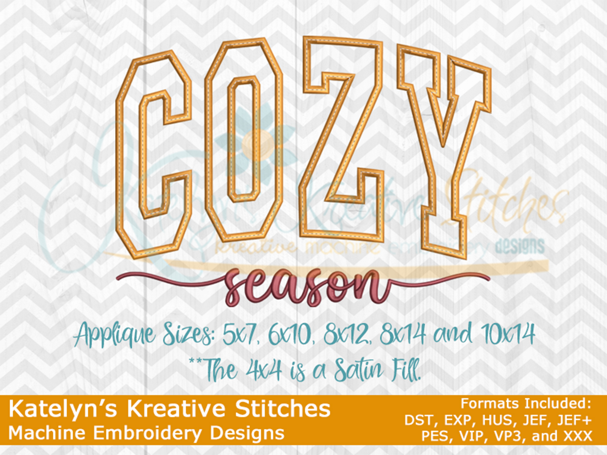 Our Cozy Season design will come in 6 sizes. The 5x7, 6x10, 8x12, 8x14 and 9.5x14 will be applique. The smaller 4x4 size will be in a satin stitch. These will be great for fall and winter sweatshirts. The 4x4 size will be perfect for the pocket area of a sweatshirt.