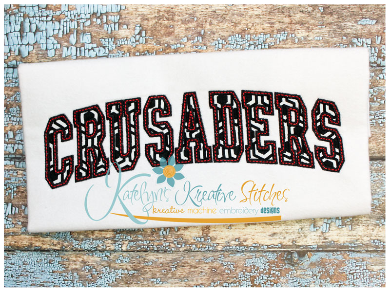 Our Arched Mascot designs will come in 5 sizes. The 5x7, 6x10, 8x12 and 8x14 will be applique. The smaller 4x4 size will be in a satin stitch. These will be great for school sweatshirts and tees. The 4x4 size will be perfect for polo's too.