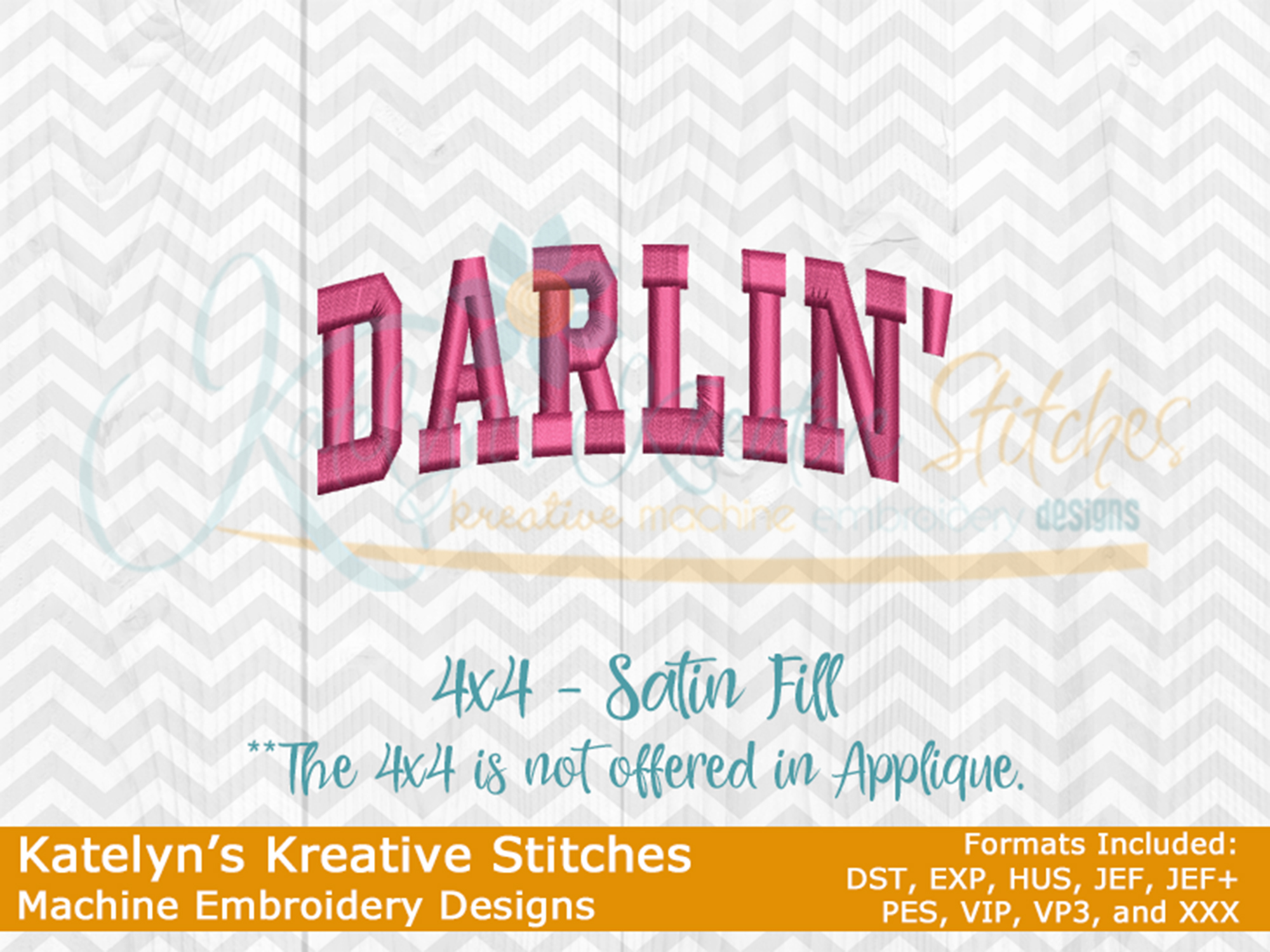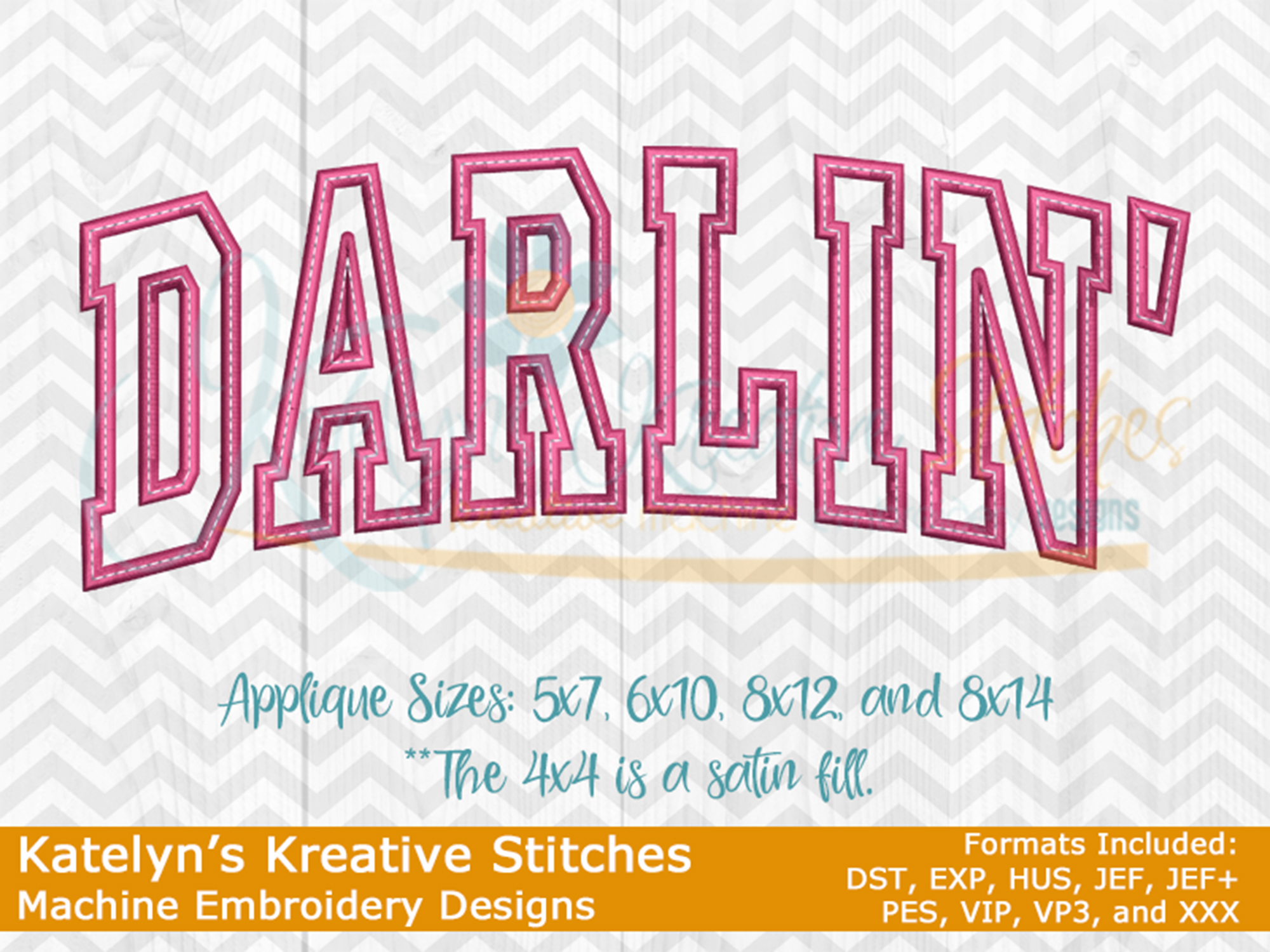 Our Darlin' arched embroidery design will come in 5 sizes. The 5x7, 6x10, 8x12 and 8x14 will be applique. The smaller 4x4 size will be in a satin stitch. These will be great for sweatshirts and tees. The 4x4 size will be perfect for polo's too.
