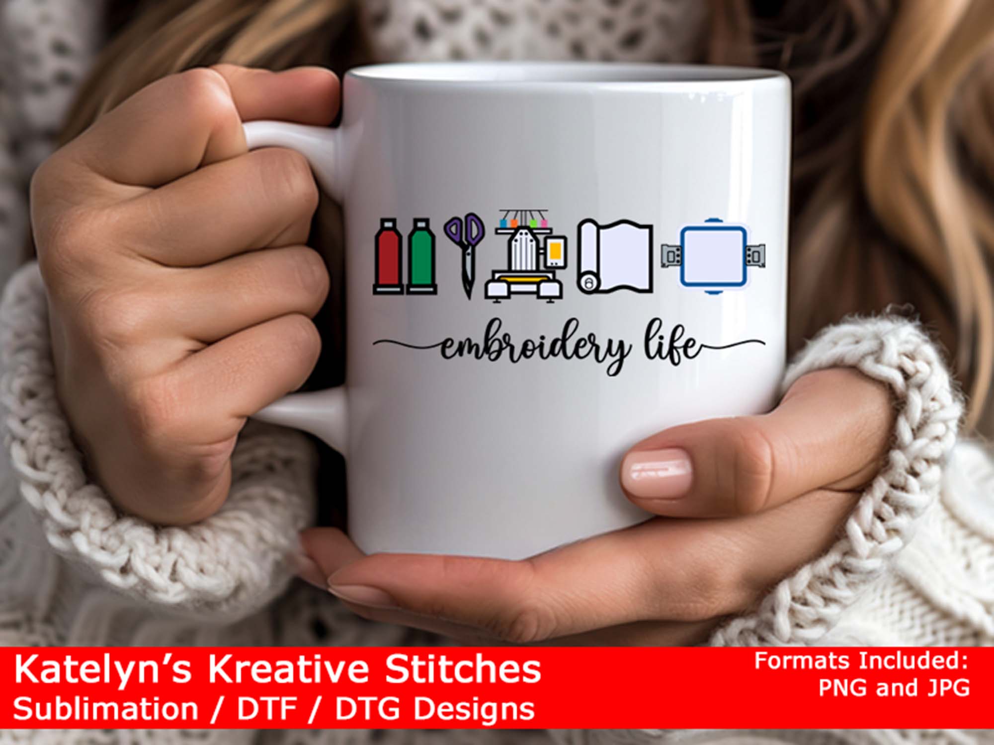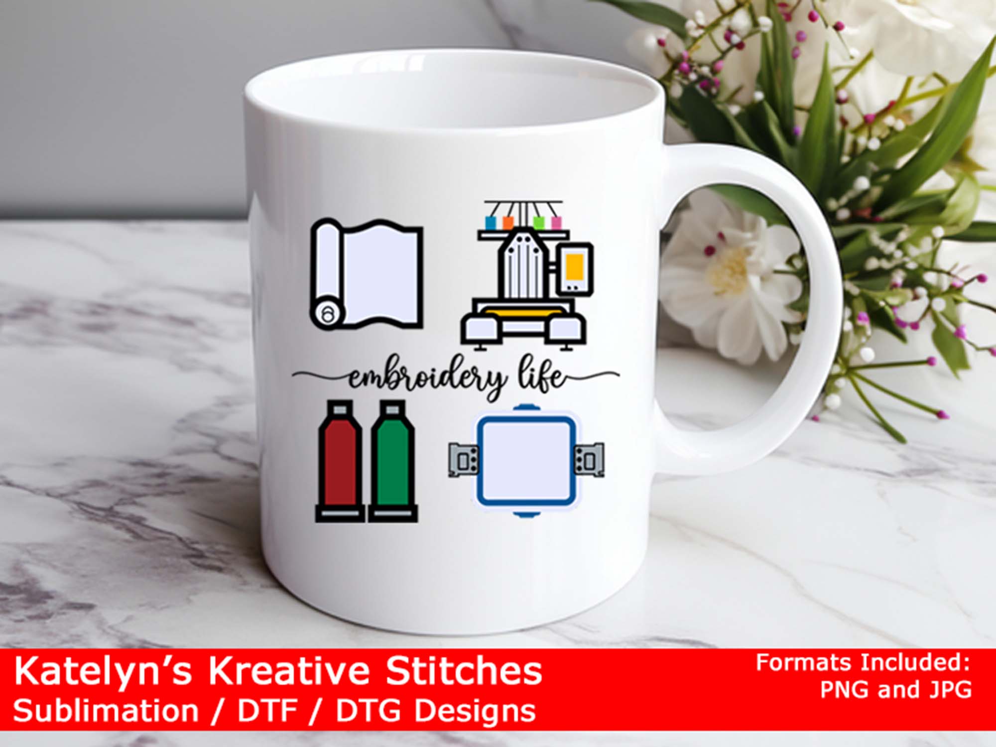 Our Embroidery Life Icon design can be used for Sublimation or DTF Files for paper printed projects or items for purchase. We took our very own digitized file and created this Super Cute Print. This one download will include all three versions. We used the single embroidery machine icon on a mug and added our Business Name to it. The ideas are endless!
