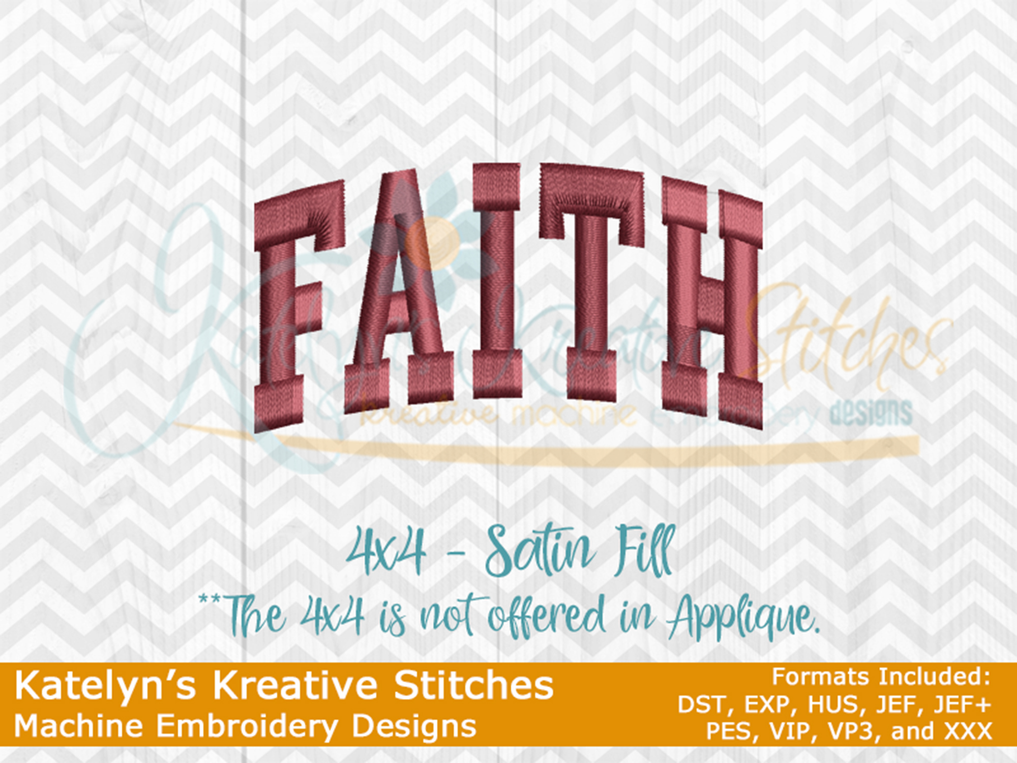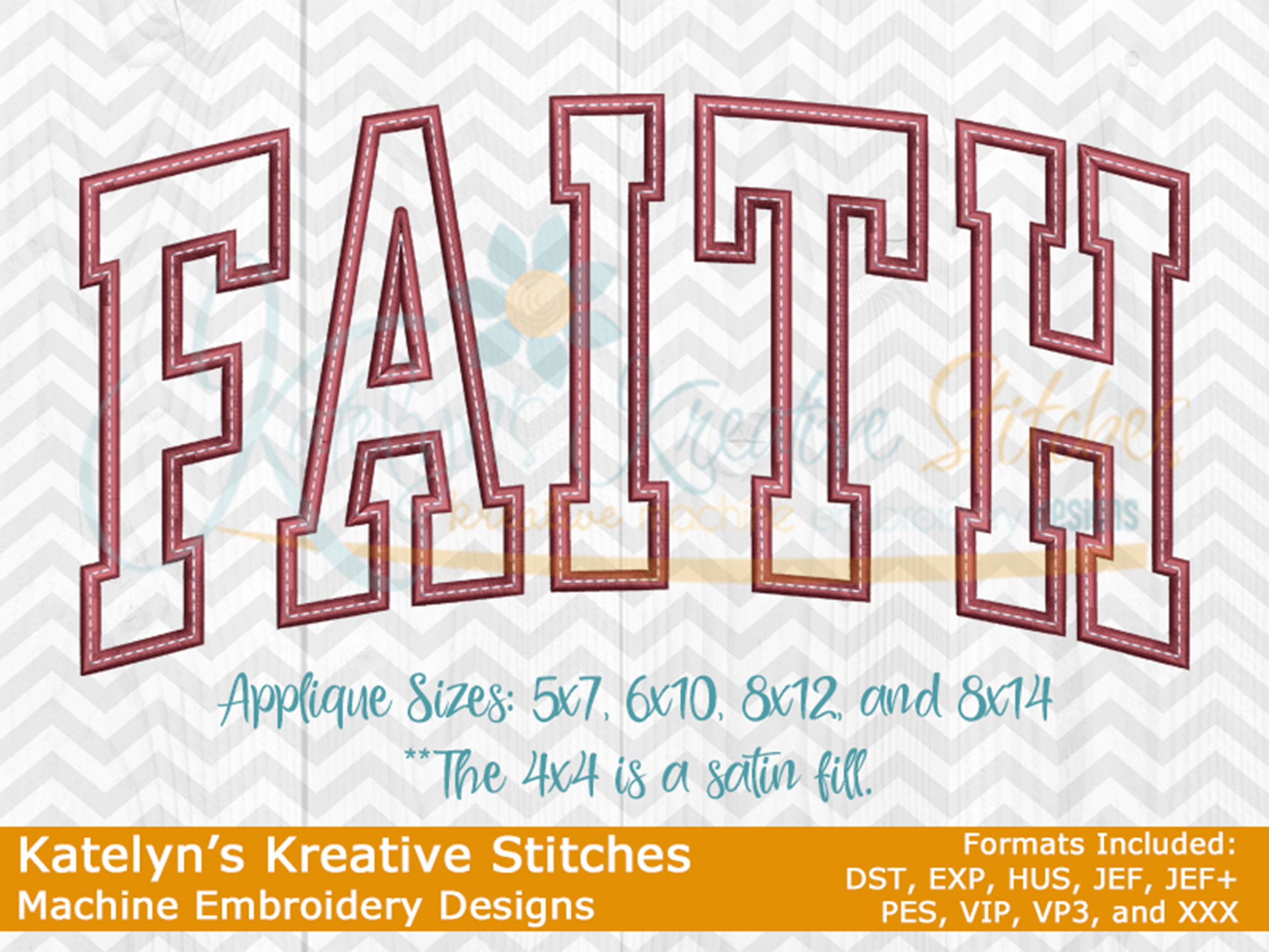 Our Faith arched embroidery design will come in 5 sizes. The 5x7, 6x10, 8x12 and 8x14 will be applique. The smaller 4x4 size will be in a satin stitch. These will be great for sweatshirts and tees. The 4x4 size will be perfect for polo's too.