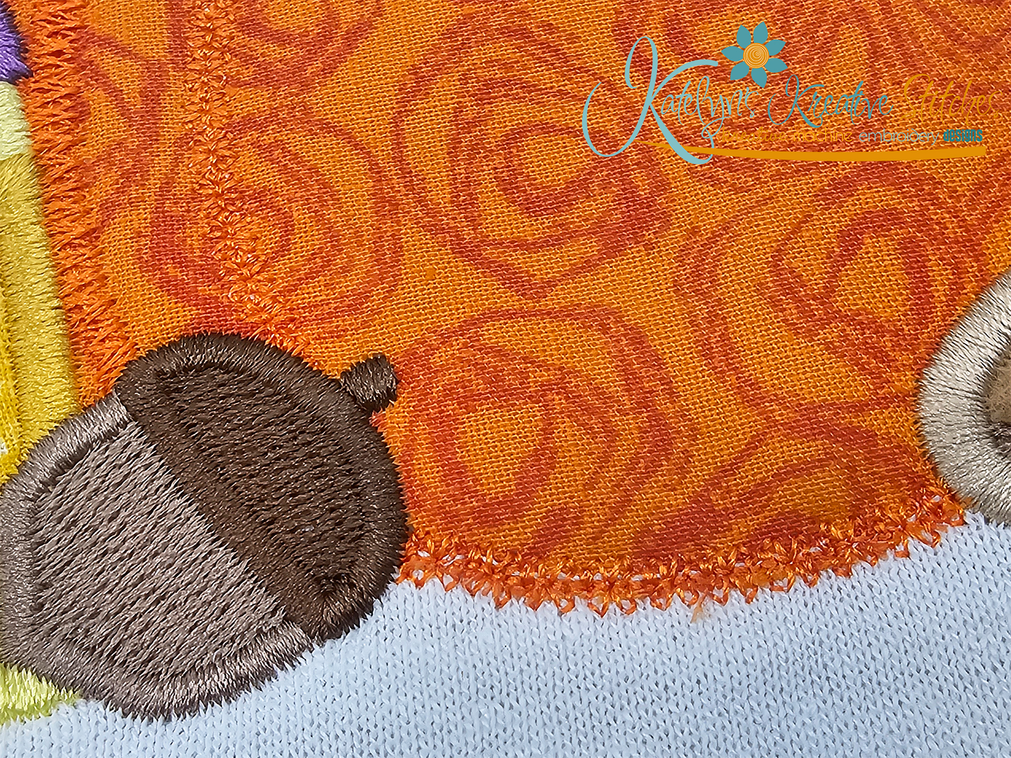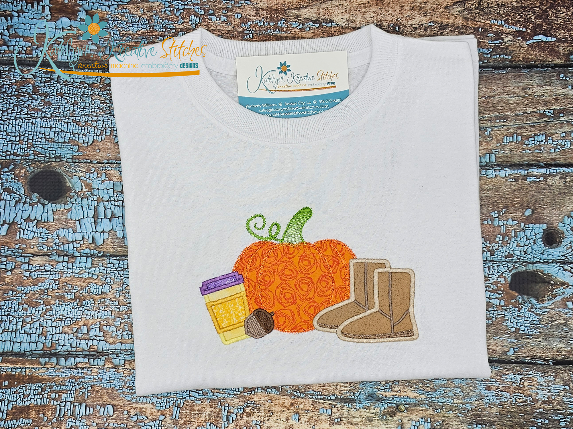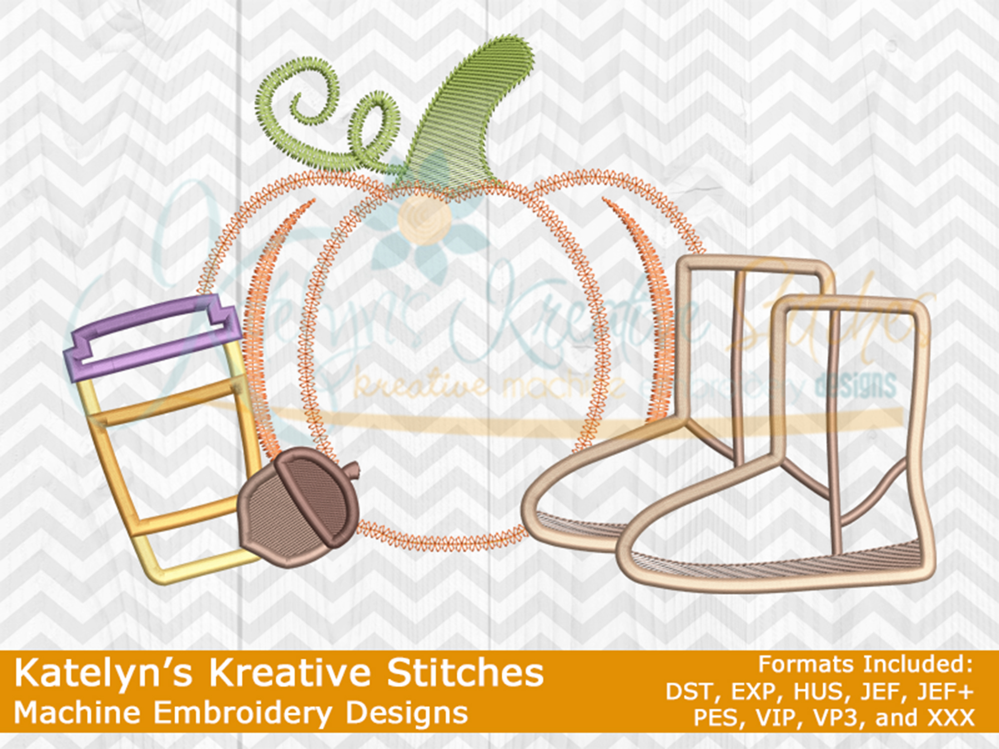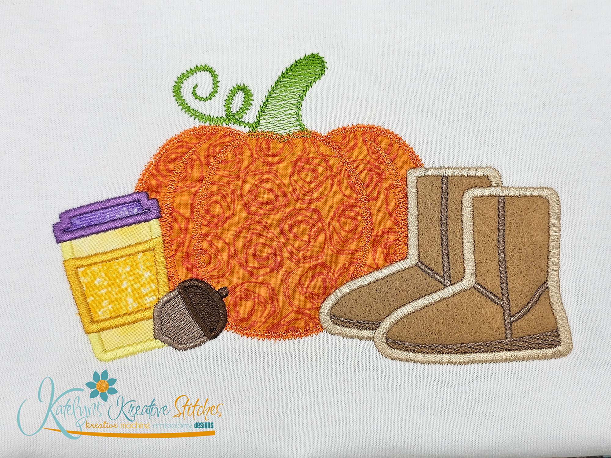 Our Fall Weather applique embroidery design is perfect for Cozy Season.  The pumpkin is outlined in a motif fill instead of a satin outline. It will come in 5 sizes.  The 5x7, 6x10, 8x8, 8x12, 8x14.