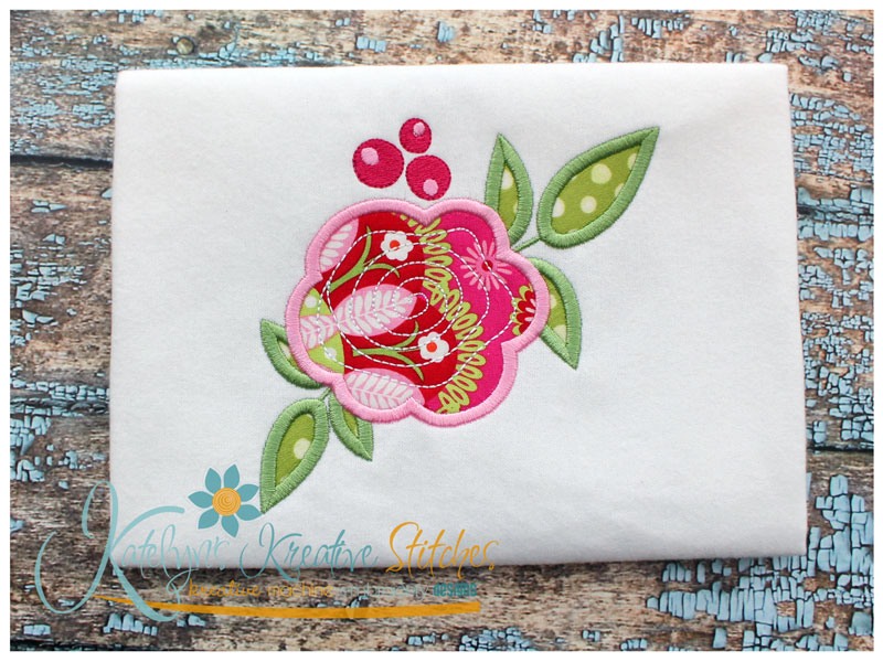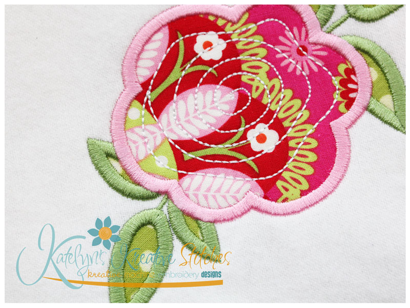 Our Flower applique is perfect for something quick and simple. This design will fit the 4x4, 5x7, 6x10 and 9x9 hoop sizes.