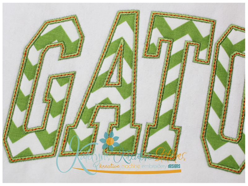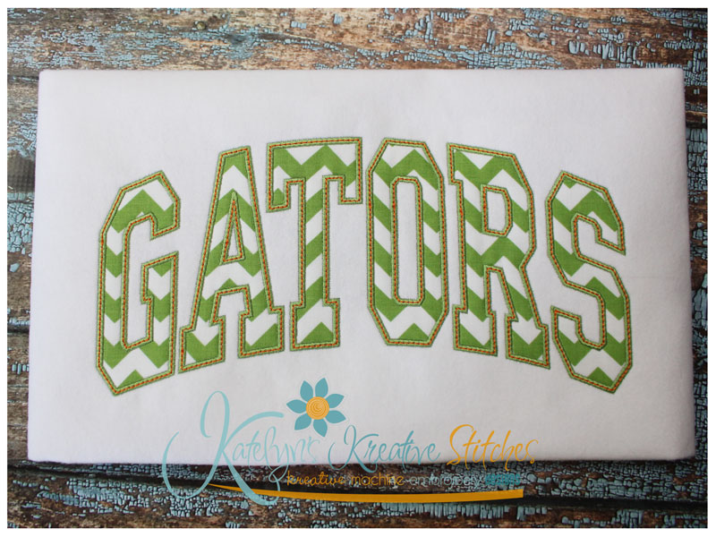 Our Arched Mascot designs will come in 5 sizes. The 5x7, 6x10, 8x12 and 8x14 will be applique. The smaller 4x4 size will be in a satin stitch. These will be great for school sweatshirts and tees. The 4x4 size will be perfect for polo's too.