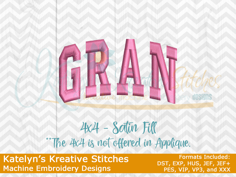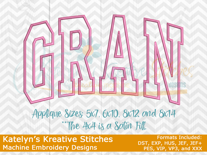 Our Arched designs will come in 5 sizes. The 5x7, 6x10, 8x12 and 8x14 will be applique. The smaller 4x4 size will be in a satin stitch. These will be great for sweatshirts and tees. The 4x4 size will be perfect for polo's too.