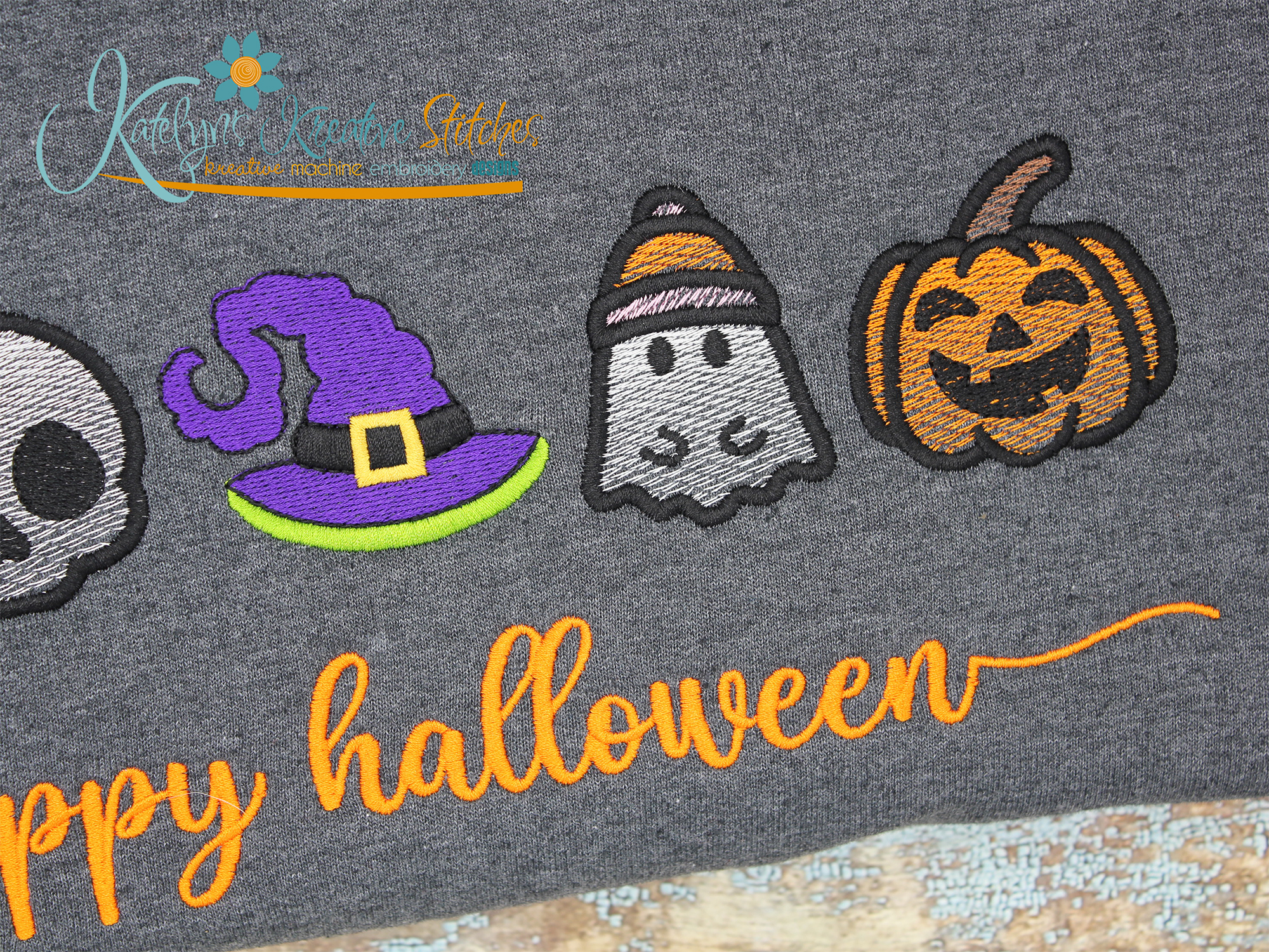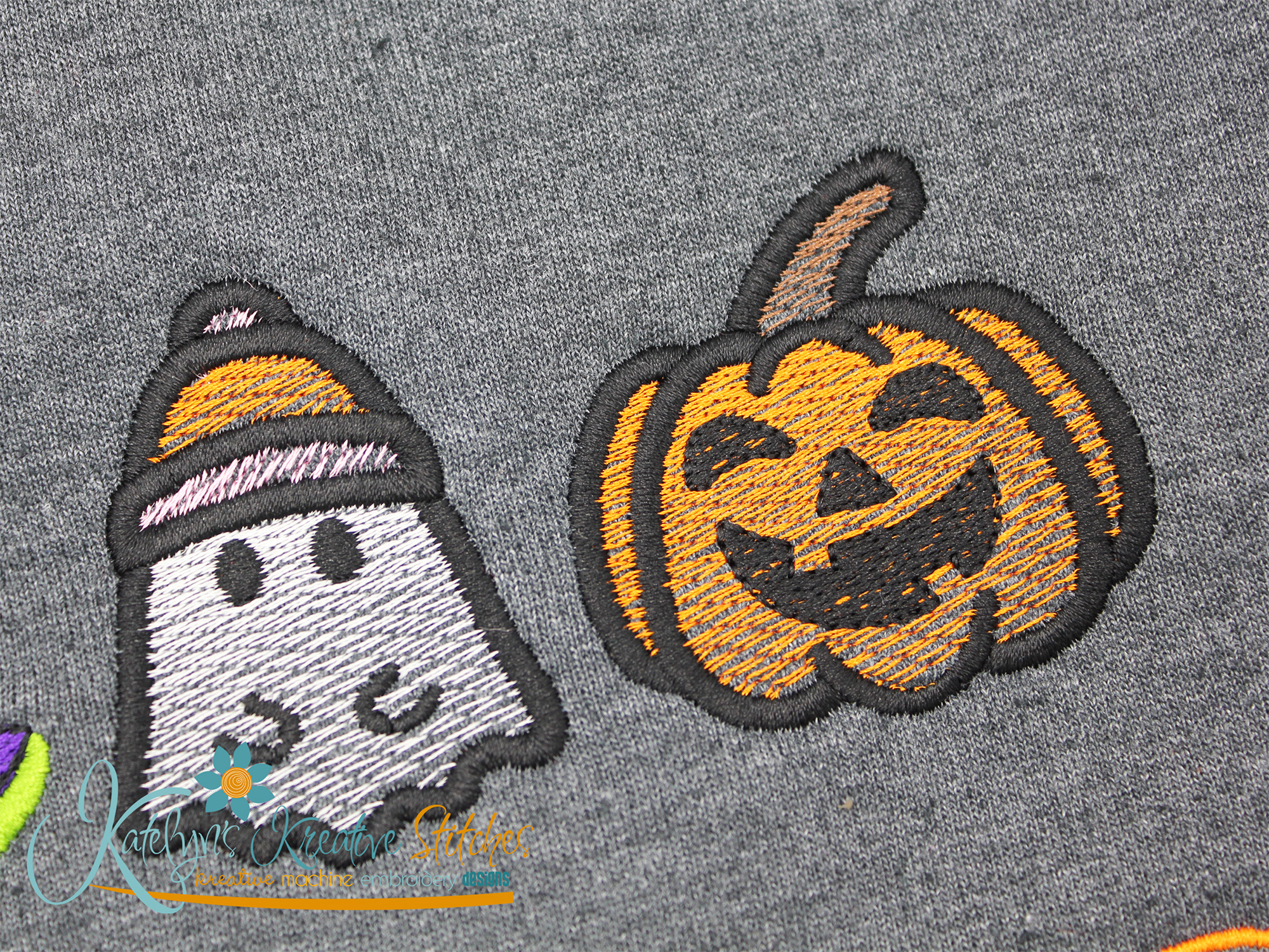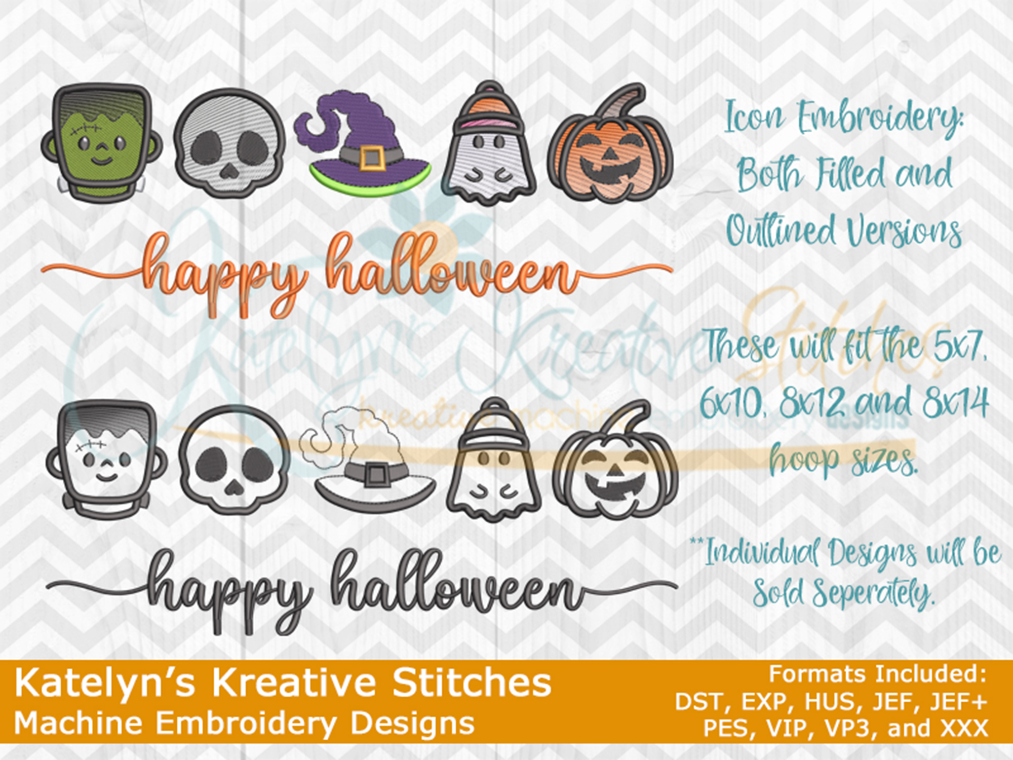 Our Happy Halloween icon embroidery designs will come in two versions. One will be a multi colored fill stitch and the other will be a single colored satin outline. These designs will fit the 5x7, 6x10, 8x12 and 8x14 hoop sizes. It "does not" include the 4x4 size, however you can purchase the designs separately in smaller sizes, so they can be hooped individually.