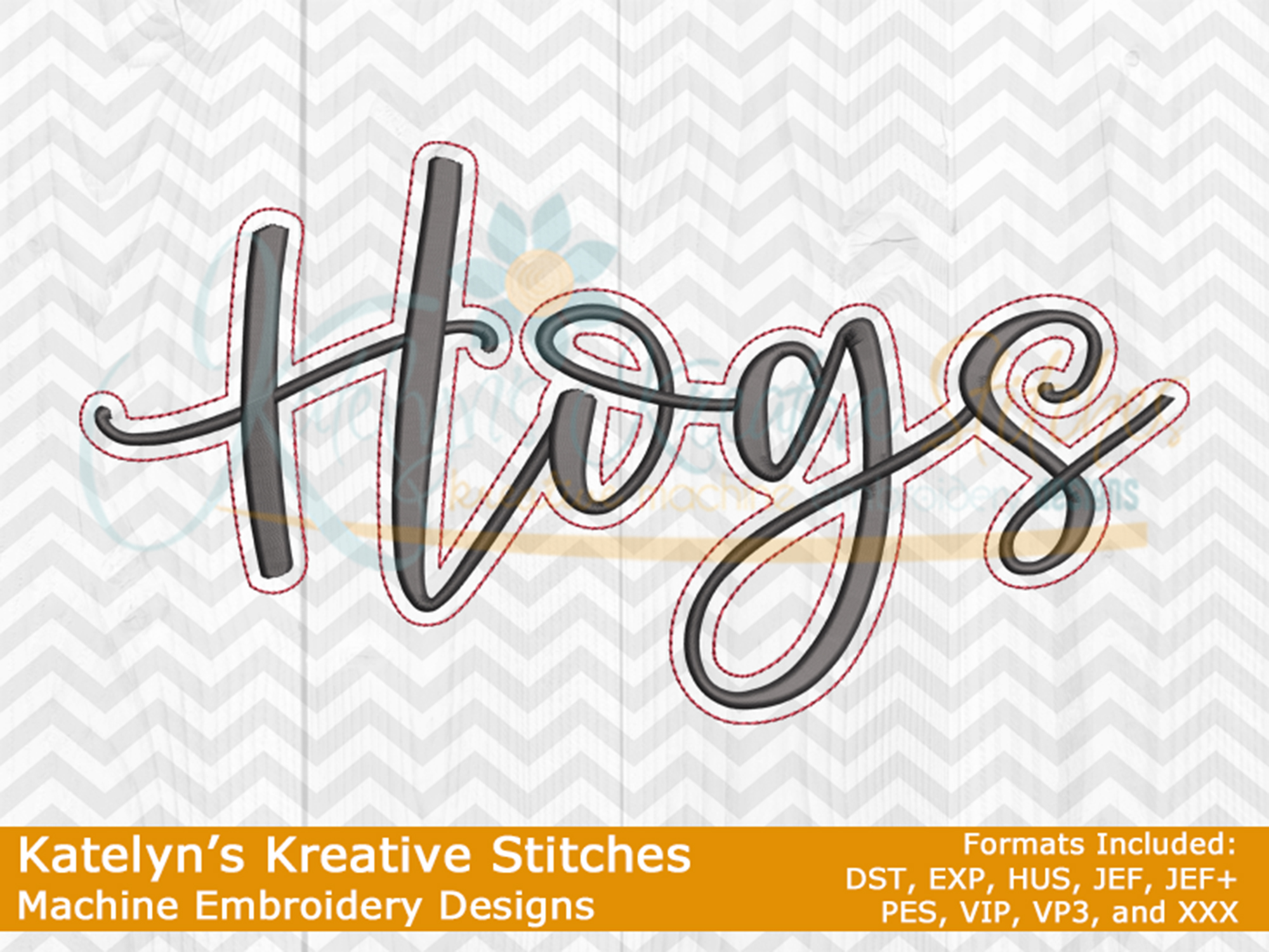 Our Hogs Script will come in 5 sizes for a quick and simple stitch out.  They will fit the 4x4, 5x7, 6x10, 8x12 and 8x14 hoop sizes.  These will be great for school tees, sweatshirts, hoodies, blankets, bags and much more. The 4x4 size will be perfect for polo's. Please refer to your .pdf files for design layout and color chart. Each step is labeled on the .pdf files.