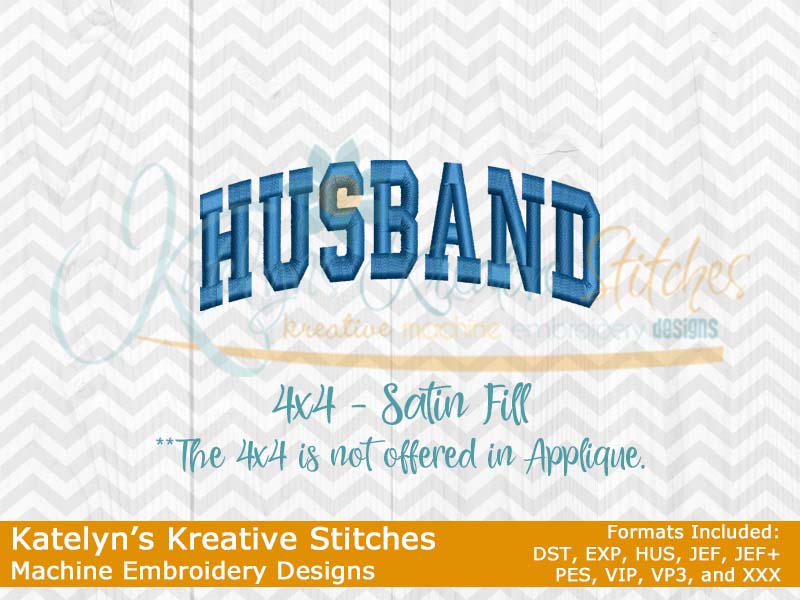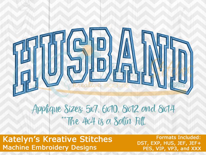 Our Arched designs will come in 5 sizes. The 5x7, 6x10, 8x12 and 8x14 will be applique. The smaller 4x4 size will be in a satin stitch. These will be great for sweatshirts and tees. The 4x4 size will be perfect for polo's too.