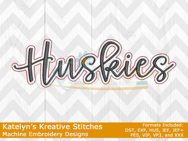 Our Huskies Script will come in 5 sizes for a quick and simple stitch out. They will fit the 4x4, 5x7, 6x10, 8x12 and 8x14 hoop sizes. These will be great for school tees, sweatshirts, hoodies, blankets, bags and much more. The 4x4 size will be perfect for polo's. Please refer to your .pdf files for design layout and color chart. Each step is labeled on the .pdf files.
