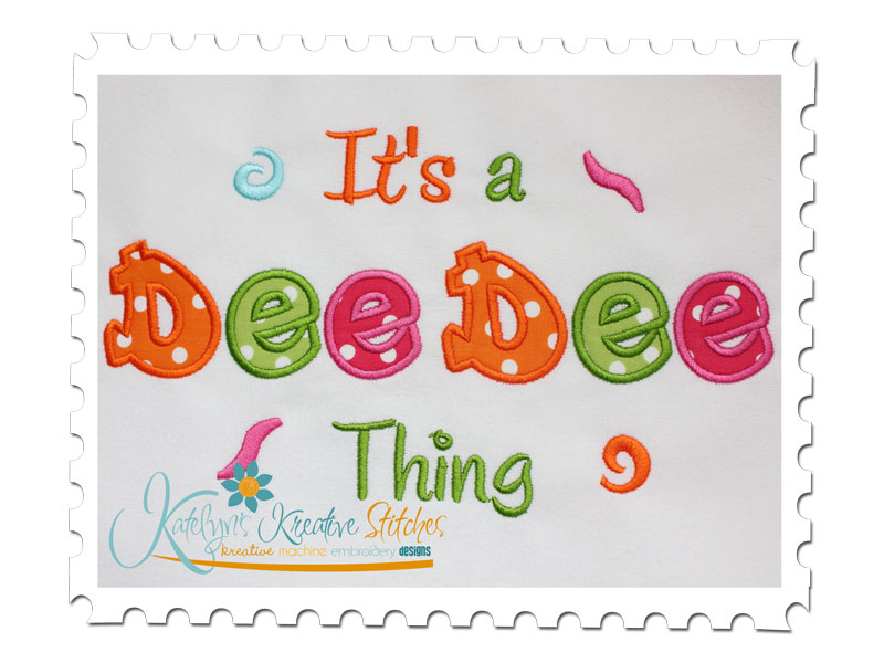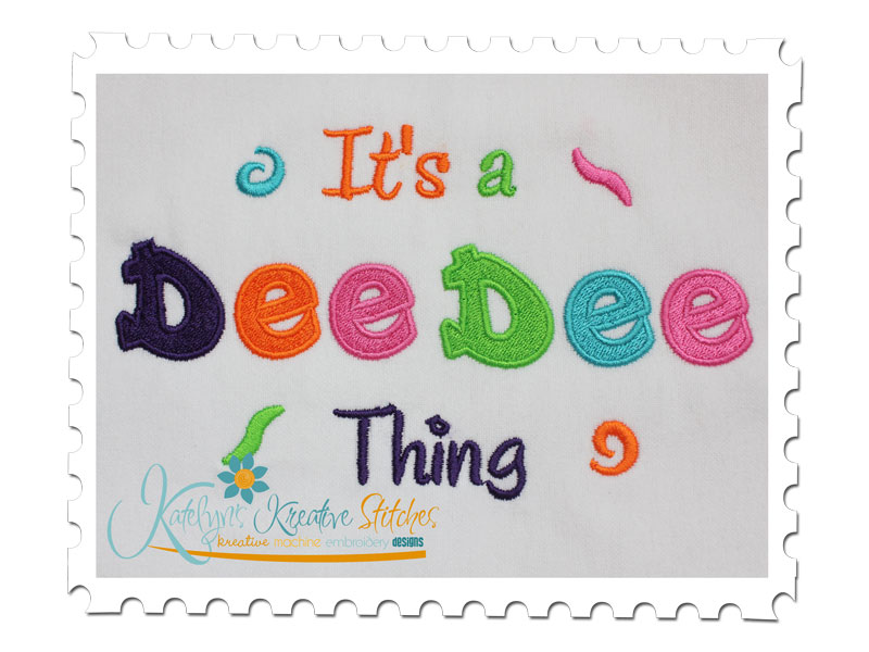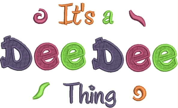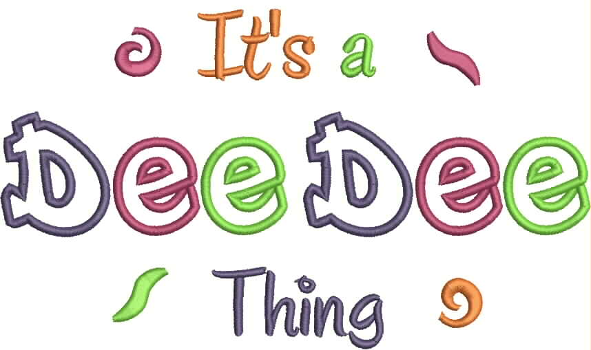 Our "It's a Dee Dee Thing" is an applique design perfect for anyone who loves their Dee Dee. It's setup for a multi color stitch out however you are welcome to change the colors to what you'd like. It will fit the 5x7, 6x10 and 11x7 hoop sizes. Don't forget to look at the included .pdf files for more information.