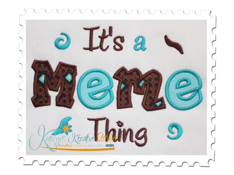 Our "It's a Meme Thing" is an applique design perfect for anyone who loves their Meme. It's setup for a multi color stitch out however you are welcome to change the colors to what you'd like. It will fit the 5x7, 6x10 and 11x7 hoop sizes. Don't forget to look at the included .pdf files for more information.