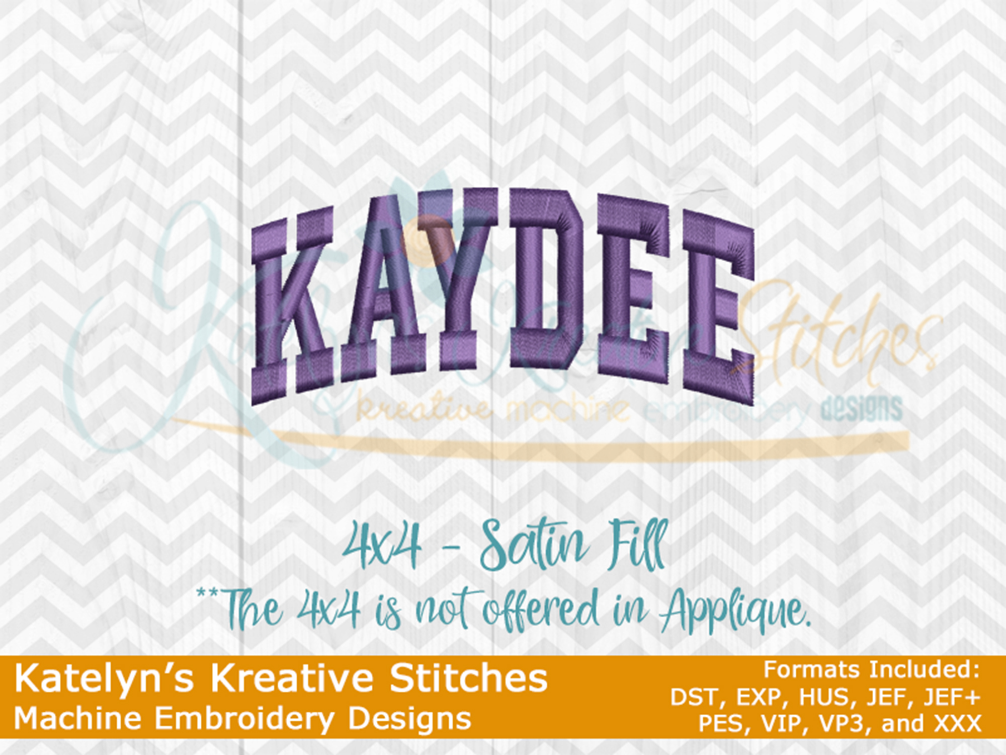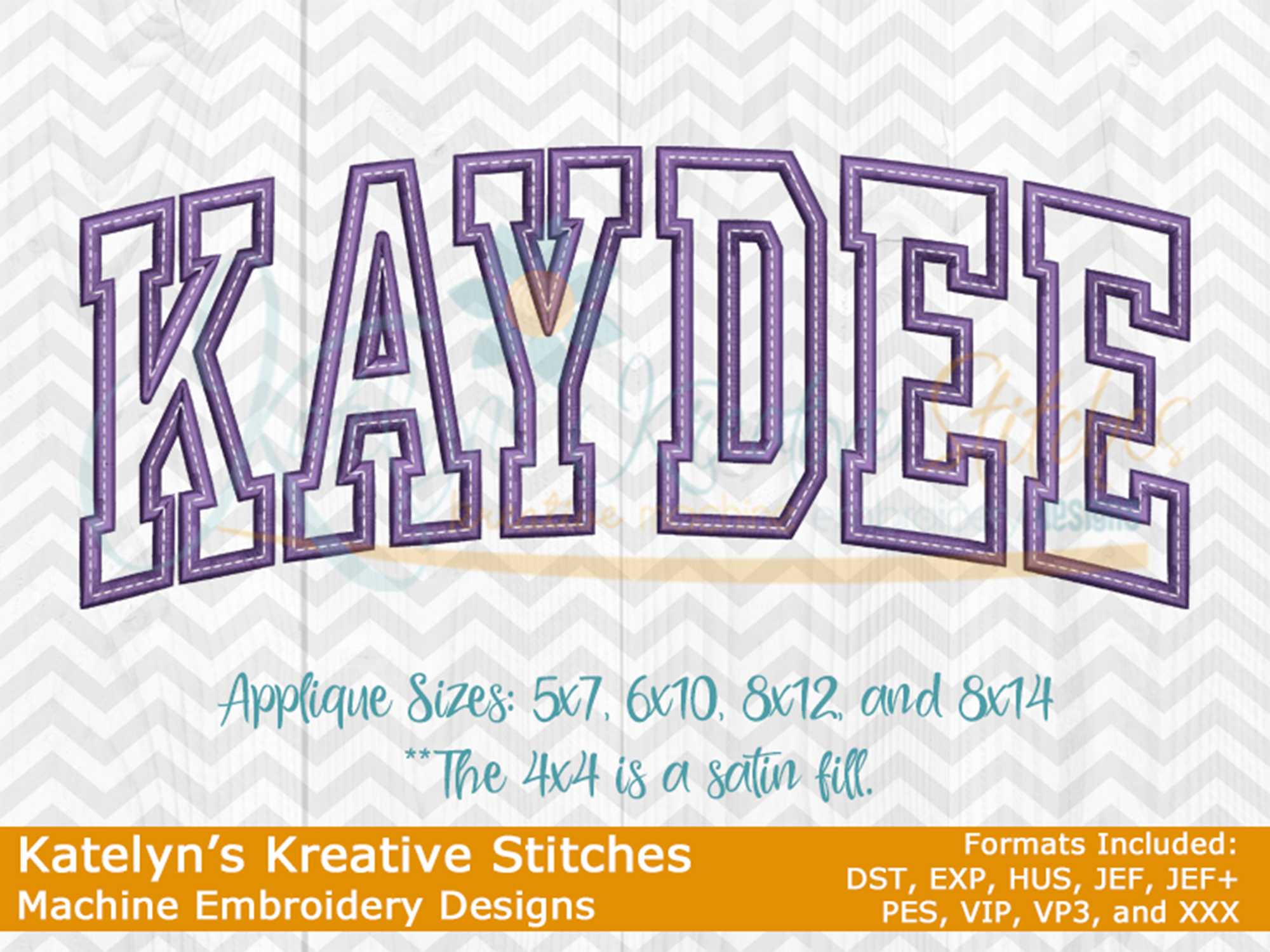 Our Kaydee arched embroidery design will come in 5 sizes. The 5x7, 6x10, 8x12 and 8x14 will be applique. The smaller 4x4 size will be in a satin stitch. These will be great for sweatshirts and tees. The 4x4 size will be perfect for polo's too.