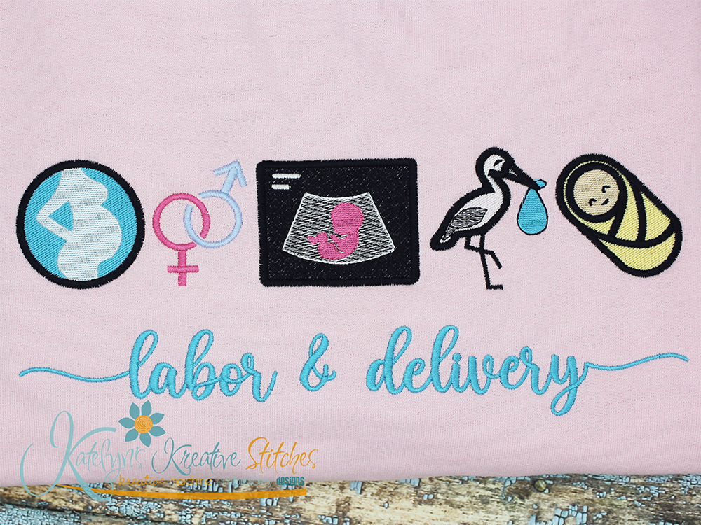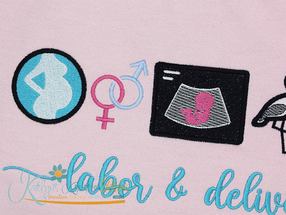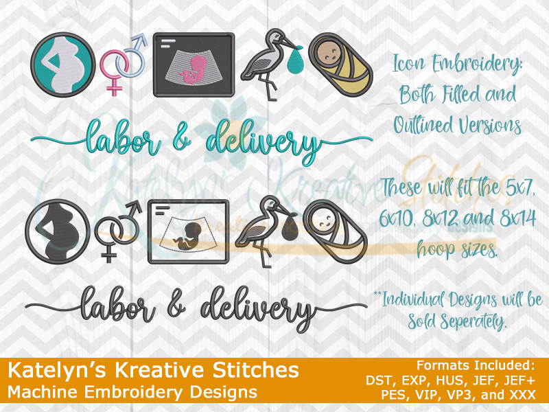 Our Labor and Delivery icon embroidery designs will come in two versions. One will be a mutli colored fill stitch and the other will be a single colored satin outline. These designs will fit the 5x7, 6x10, 8x12 and 8x14 hoop sizes. It "does not" include the 4x4 size, however you can purchase the designs separately in smaller sizes, so they can be hooped individually.