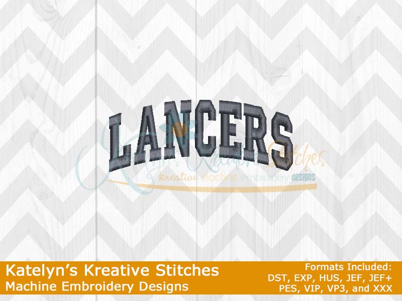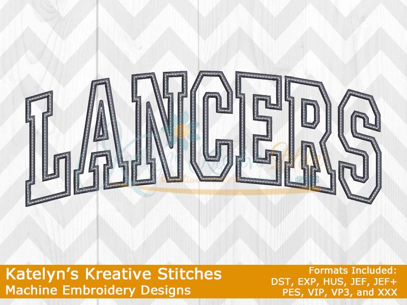 Our Arched Mascot designs will come in 5 sizes. Â The 5x7, 6x10, 8x12 and 8x14 will be applique. Â The smaller 4x4 size will be in a satin stitch. Â These will be great for school sweatshirts and tees. Â The 4x4 size will be perfect for polo's too.