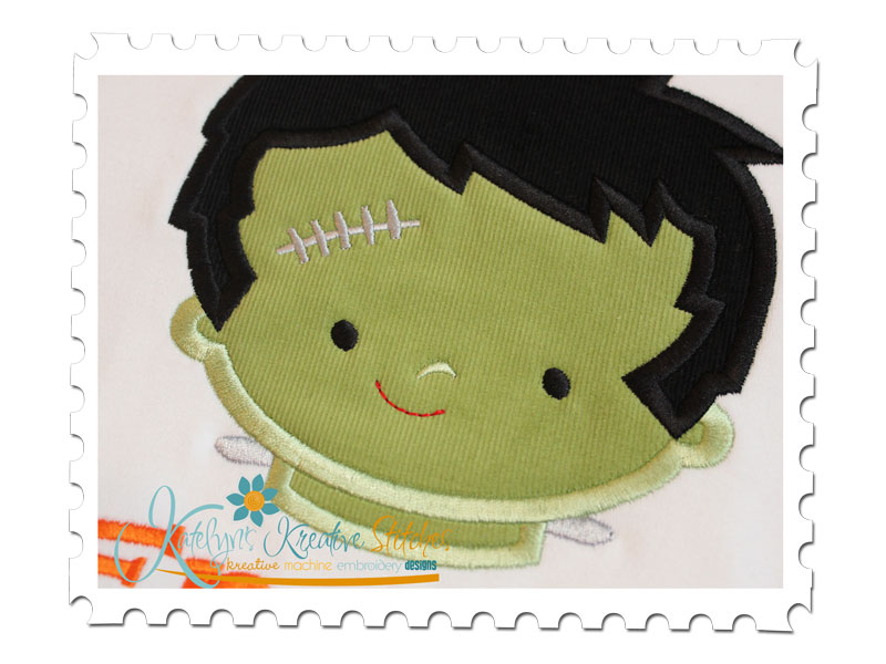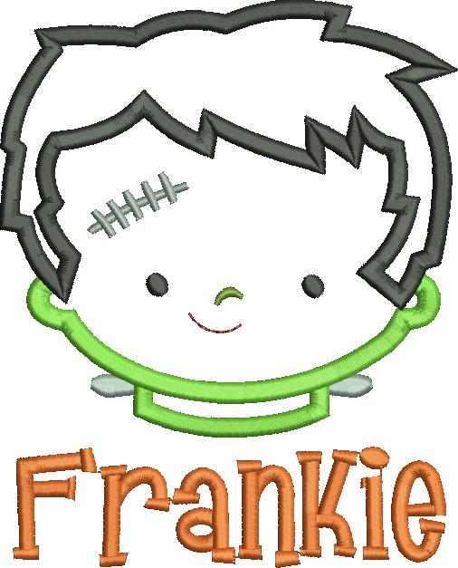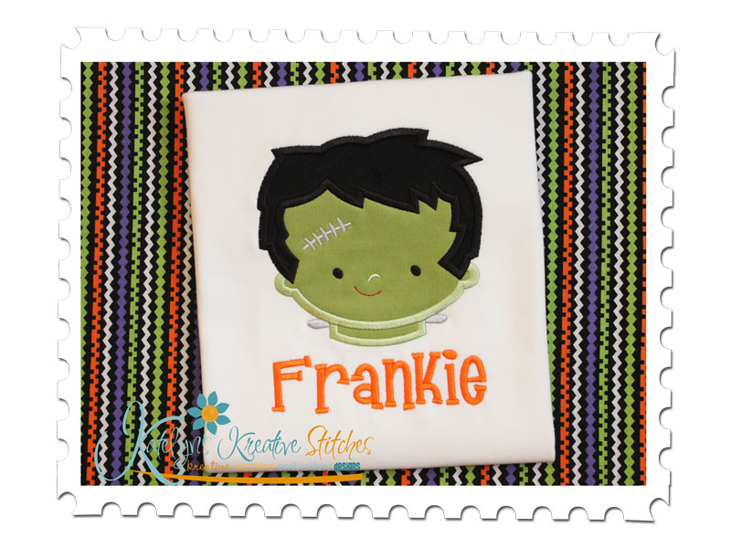 Our Little Frankie Applique Head will come in three sizes to fit the 4x4, 5x7 and 6x10 hoop sizes. He's perfect for Halloween Tees, Onesies or Bibs.