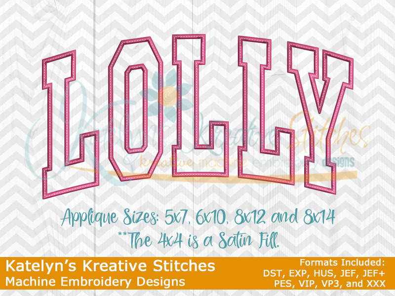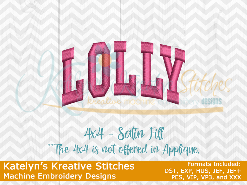 Our Arched designs will come in 5 sizes.  The 5x7, 6x10, 8x12 and 8x14 will be applique.  The smaller 4x4 size will be in a satin stitch.  These will be great for sweatshirts and tees.  The 4x4 size will be perfect for polo's too.