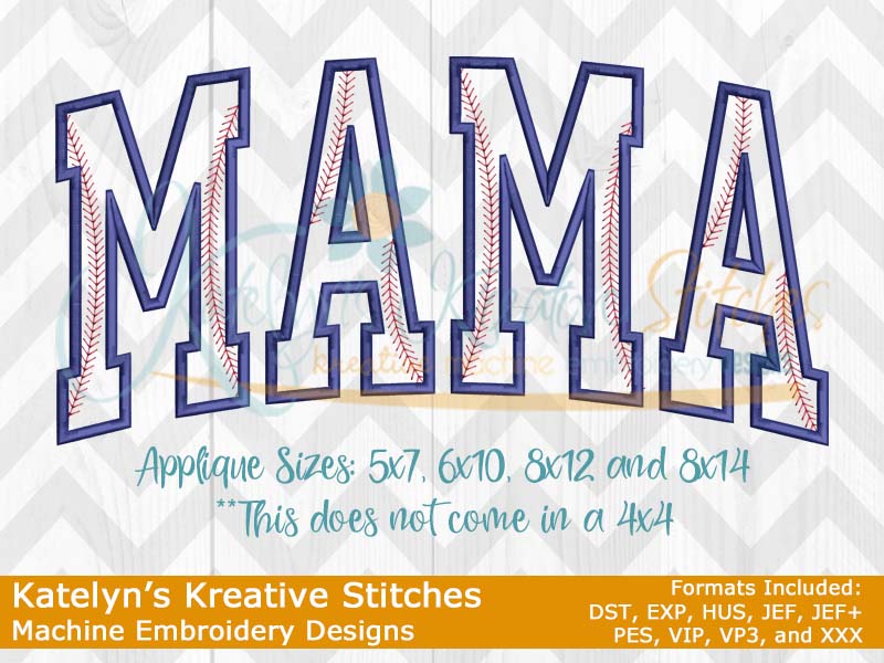 Our Mama Arched Applique with Baseball Stitches will come in 4 sizes. The 5x7, 6x10, 8x12 and 8x14 will be applique. These will be great for sweatshirts and tees.