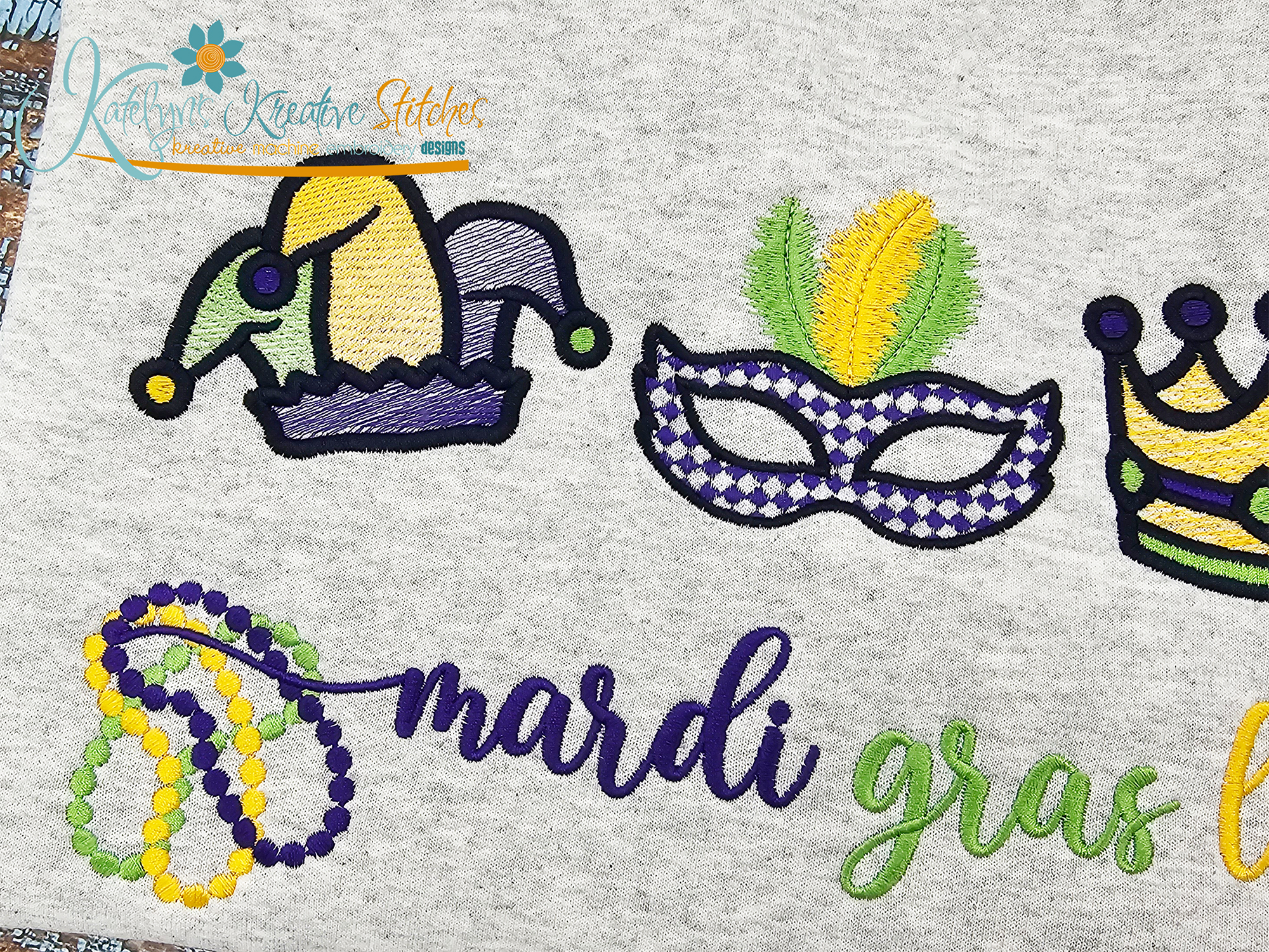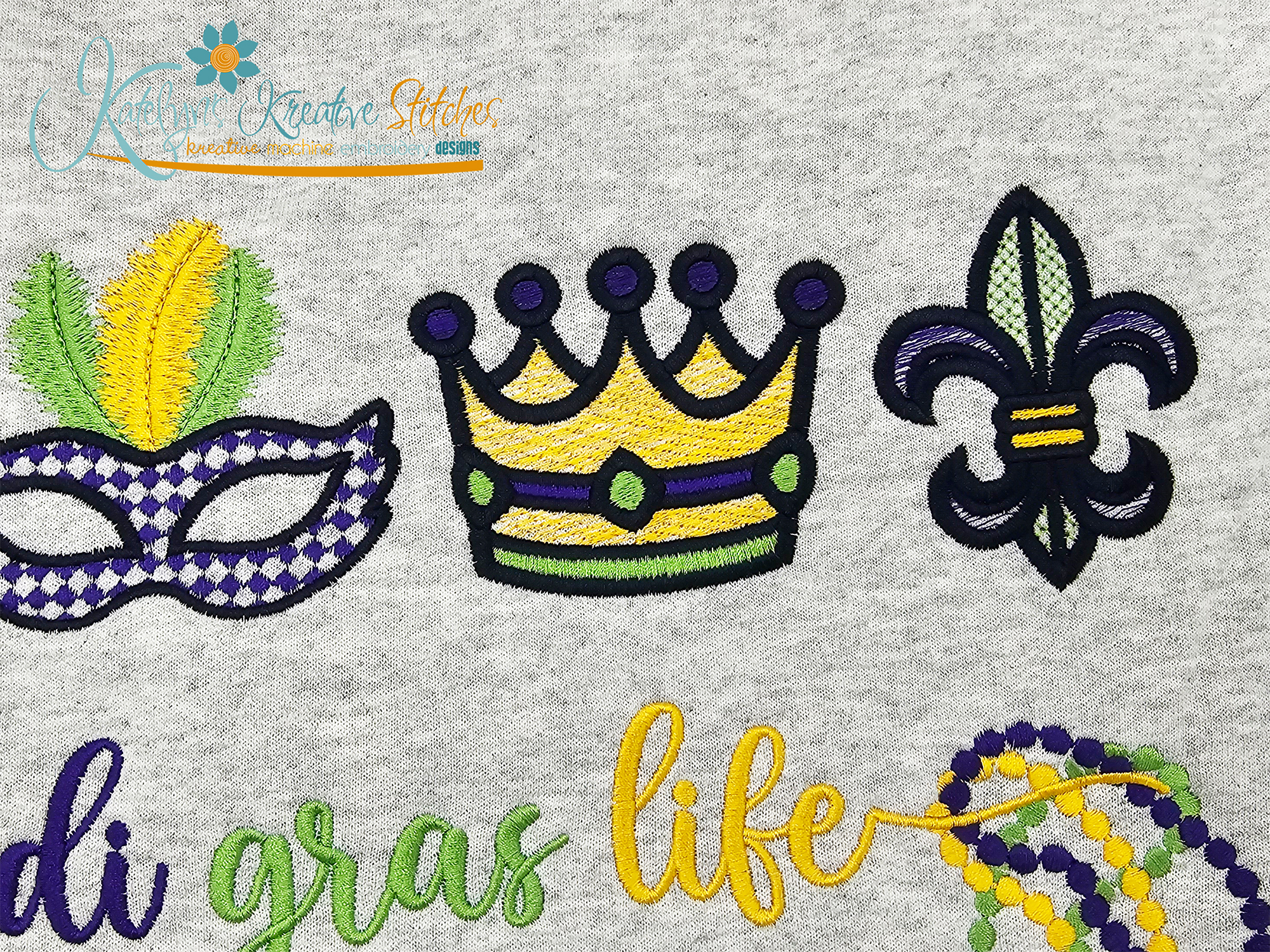 Our Mardi Gras Icon Embroidery Bundle Set will include 10 designs.  Each design will come in both a filled and outline version.  One will be a mutli colored fill stitch and the other will be a single colored satin outline.  These designs will fit the 2x2, 3x3 and 4x4 hoop sizes.  These designs can be mixed and matched to create your own icon embroidery designs, like our Mardi Gras Life design.  They are also great for monogrammed jackets, sweatshirts, tees, hoodies, blankets, towels and totes.
