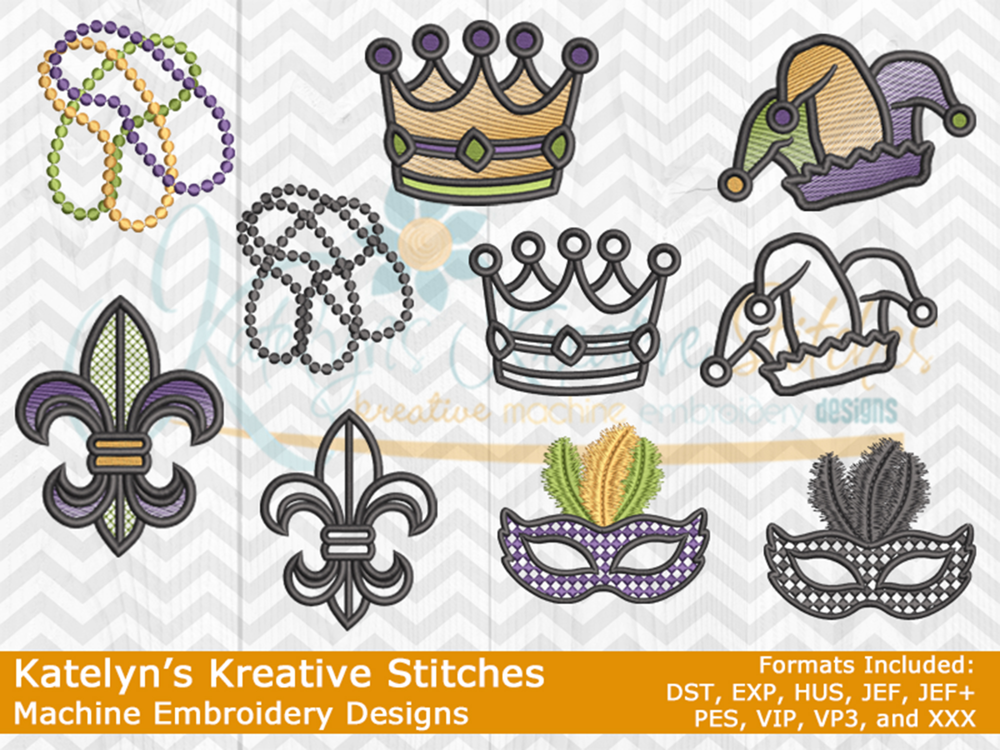 Mardi Gras Icon Embroidery Bundle Set - Filled and Outline Versions - 10 Designs