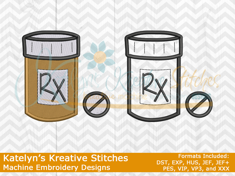 Our Medicine Bottle design will come in both a filled and outline version. One will be a mutli colored fill stitch and the other will be a single colored satin outline. This design will fit the 2x2, 3x3 and 4x4 hoop sizes. They can be mixed and matched to create your own icon embroidery designs, like our Nurse Life design. They are also great for monogrammed jackets, sweatshirts, tees, hoodies, blankets, towels and totes.