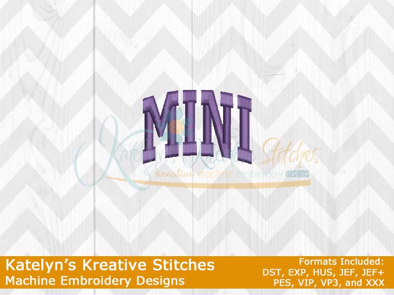 Our Arched designs will come in 5 sizes.  The 5x7, 6x10, 8x12 and 8x14 will be applique.  The smaller 4x4 size will be in a satin stitch.  These will be great for sweatshirts and tees.  The 4x4 size will be perfect for polo's too.