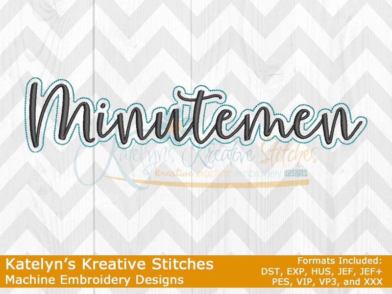 Our Minutemen Script will come in 5 sizes for a quick and simple stitch out. They will fit the 4x4, 5x7, 6x10, 8x12 and 8x14 hoop sizes. These will be great for school tees, sweatshirts, hoodies, blankets, bags and much more. The 4x4 size will be perfect for polo's. Please refer to your .pdf files for design layout and color chart. Each step is labeled on the .pdf files.