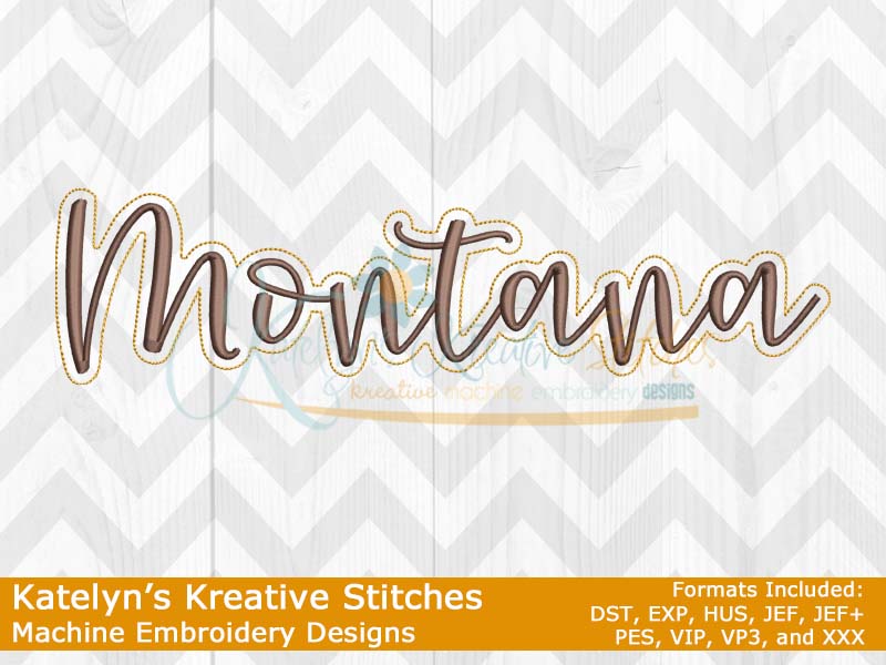 Our Montana Script will come in 5 sizes for a quick and simple stitch out. They will fit the 4x4, 5x7, 6x10, 8x12 and 8x14 hoop sizes. These will be great for tees, sweatshirts, hoodies, blankets, bags and much more. The 4x4 size will be perfect for polo's. Please refer to your .pdf files for design layout and color chart. Each step is labeled on the .pdf files.