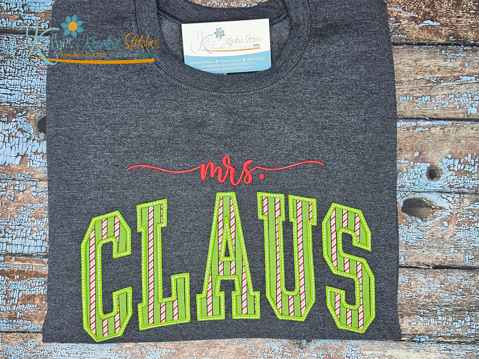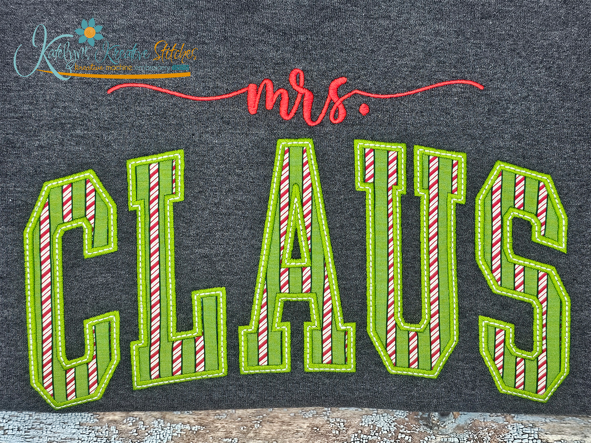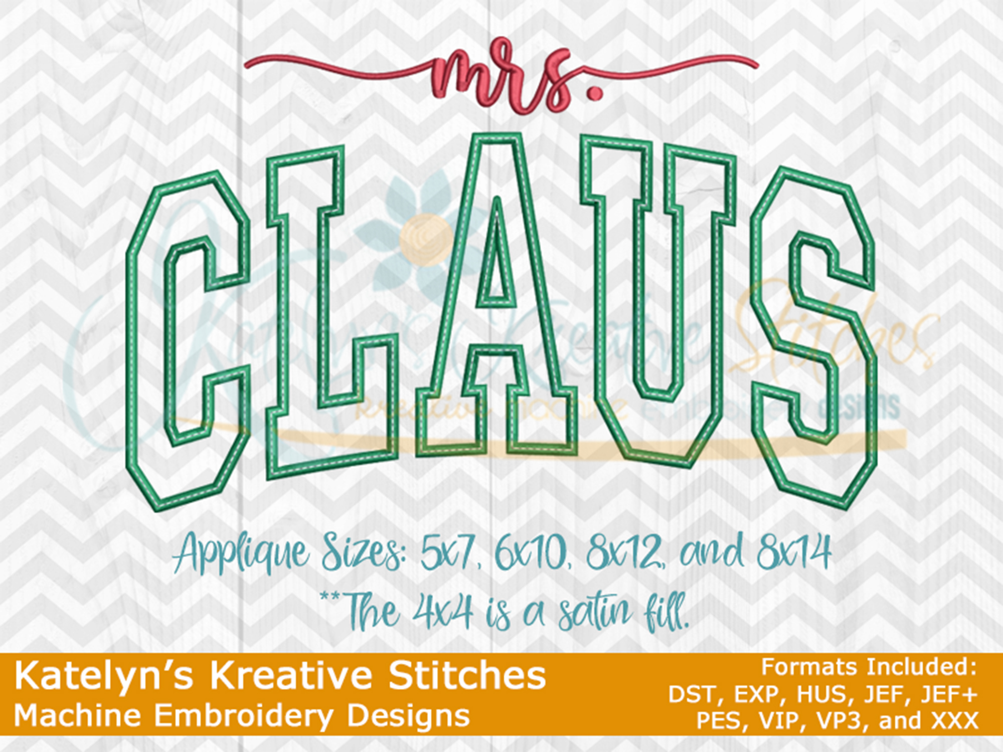 Our Mrs. Claus arched embroidery design will come in 5 sizes.  The 5x7, 6x10, 8x12 and 8x14 will be applique.  The smaller 4x4 size will be in a satin stitch.  These will be great for fall and winter sweatshirts.  The 4x4 size will be perfect for the pocket area of a sweatshirt or jacket.