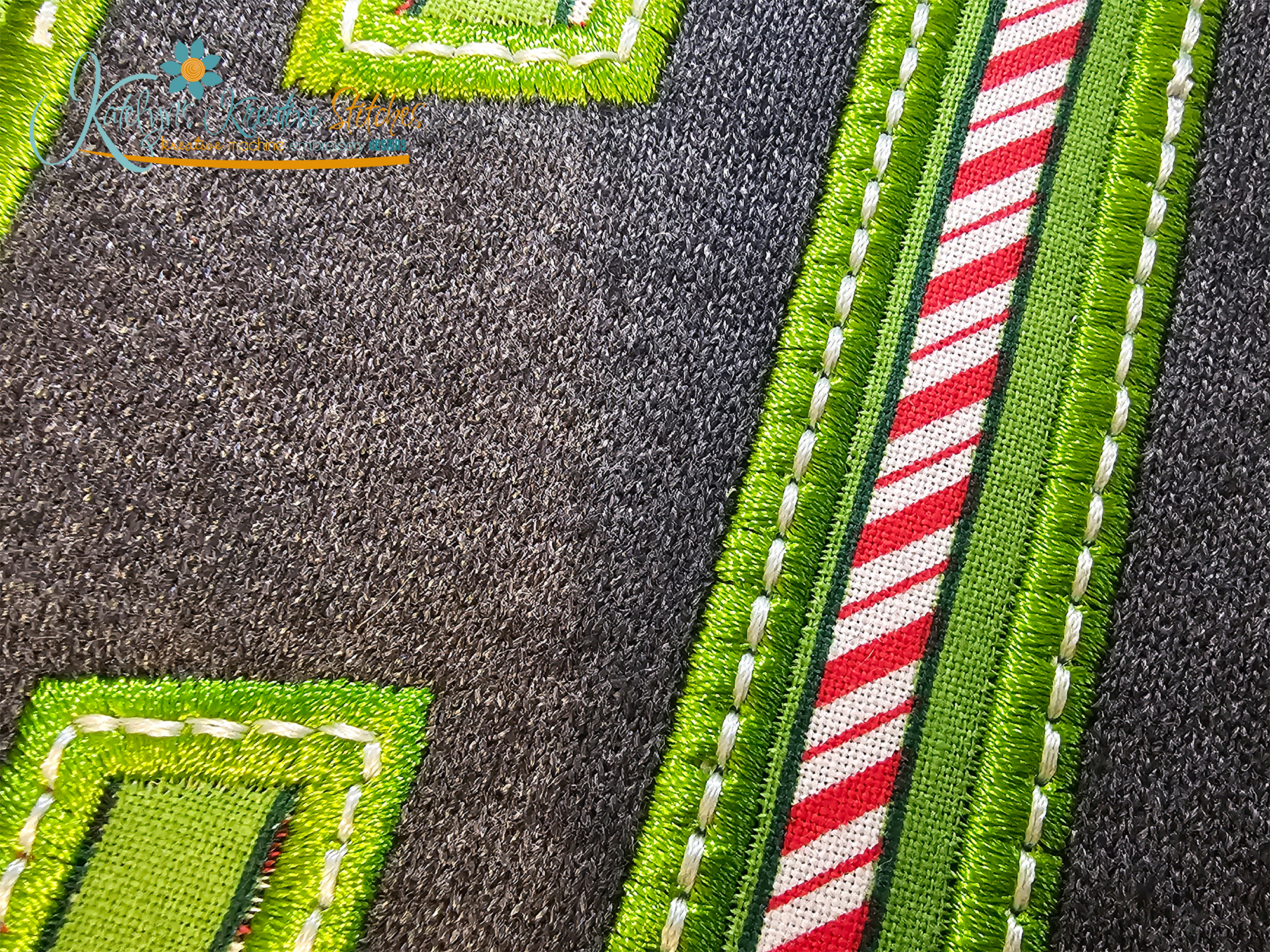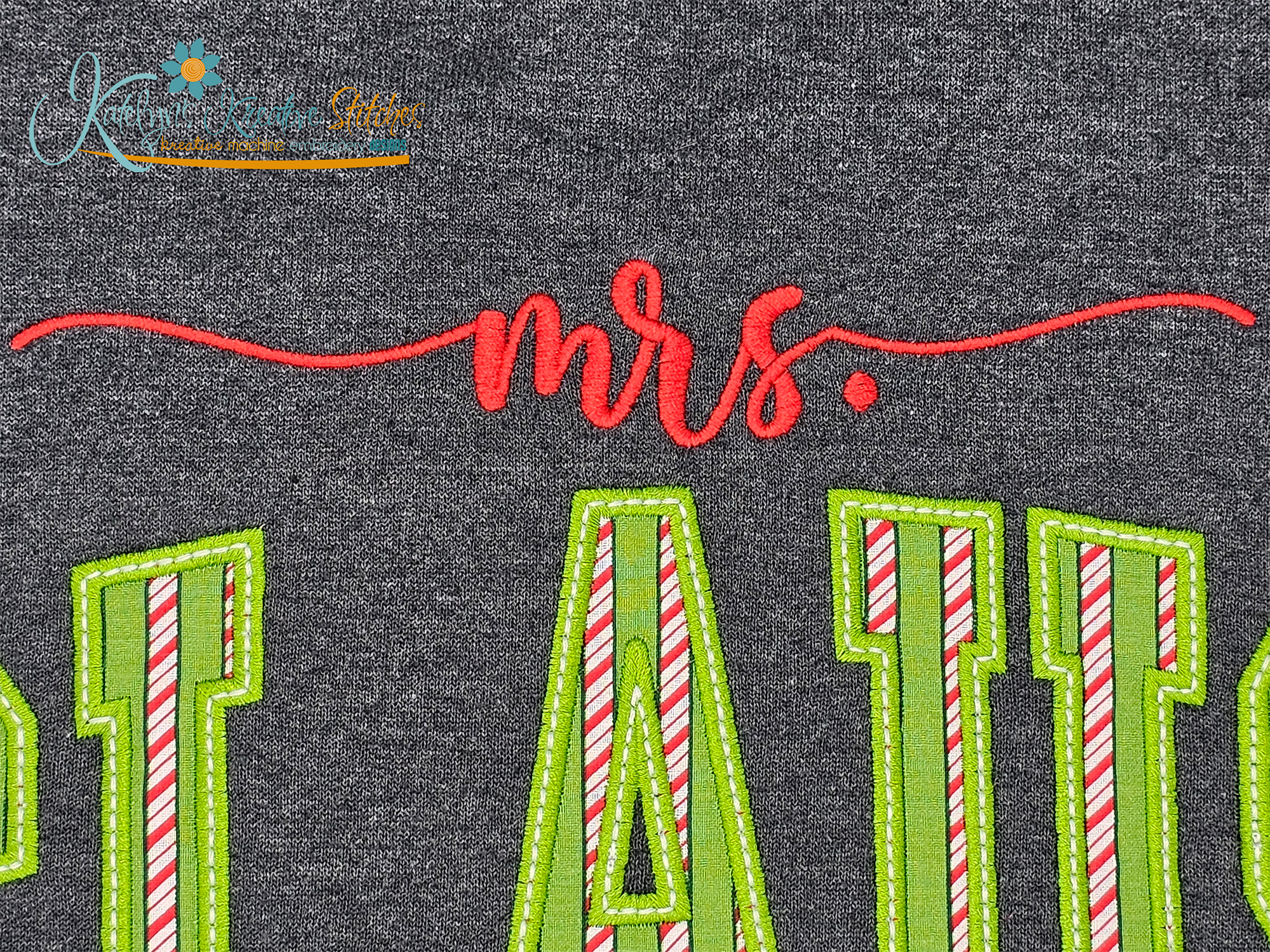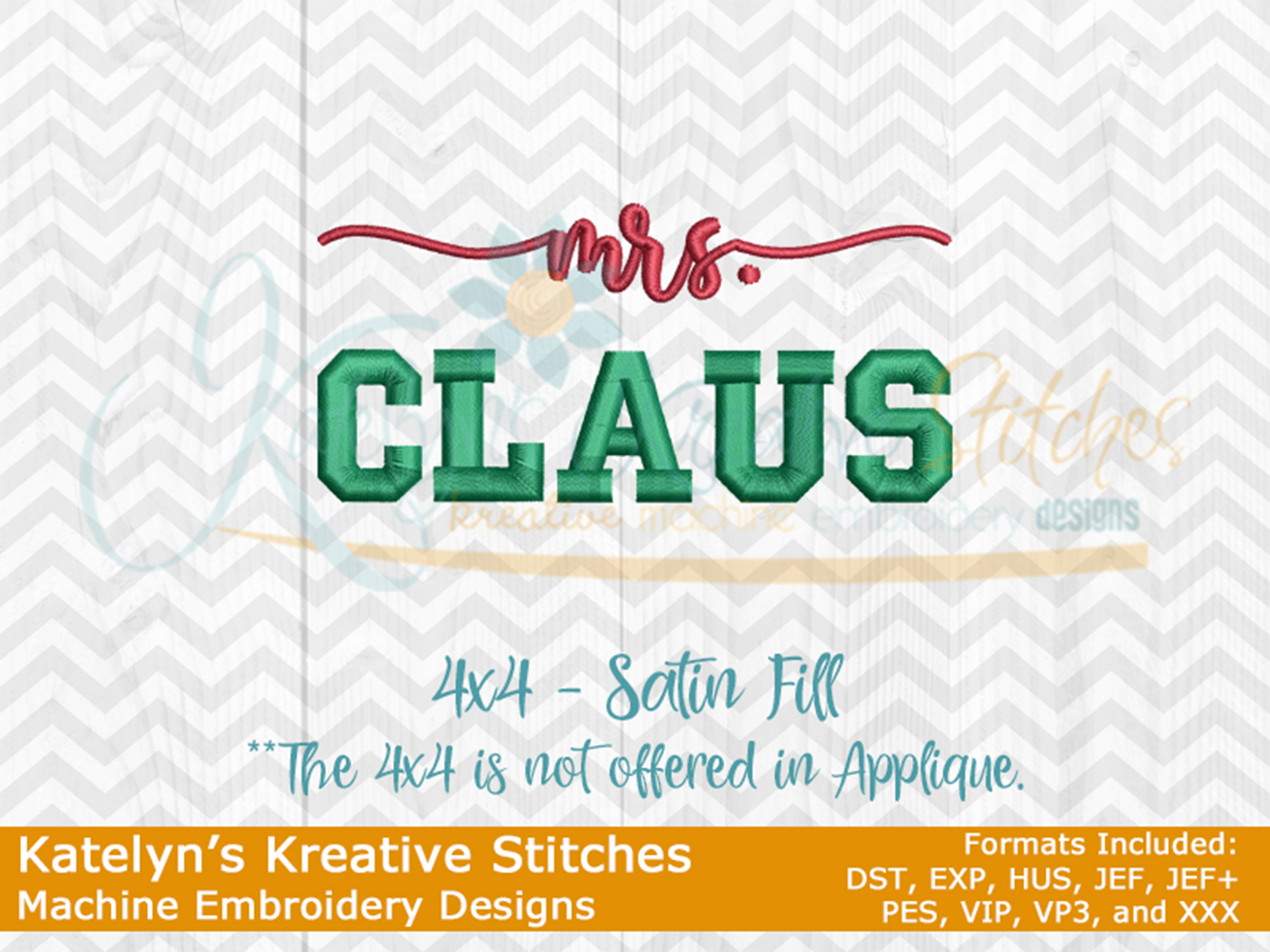 Our Mrs. Claus arched embroidery design will come in 5 sizes.  The 5x7, 6x10, 8x12 and 8x14 will be applique.  The smaller 4x4 size will be in a satin stitch.  These will be great for fall and winter sweatshirts.  The 4x4 size will be perfect for the pocket area of a sweatshirt or jacket.