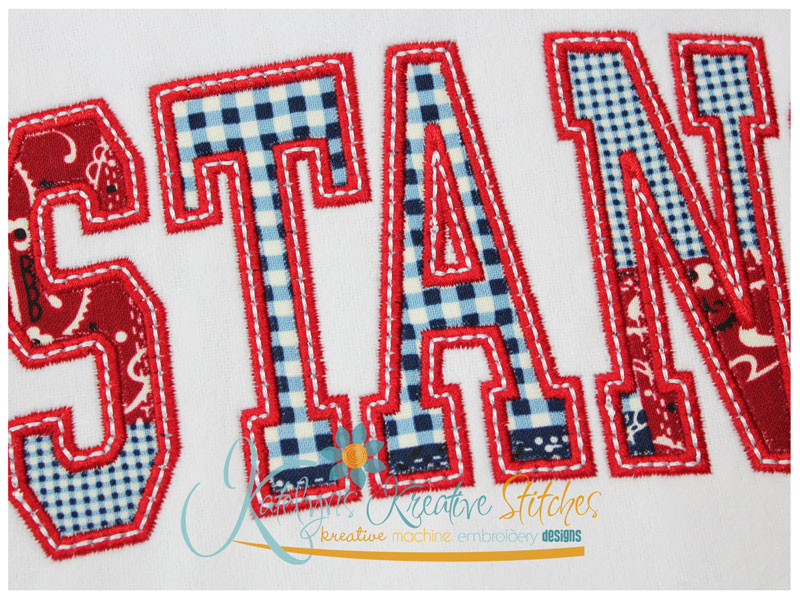 Our Arched Mascot designs will come in 5 sizes. The 5x7, 6x10, 8x12 and 8x14 will be applique. The smaller 4x4 size will be in a satin stitch. These will be great for school sweatshirts and tees. The 4x4 size will be perfect for polo's too.
