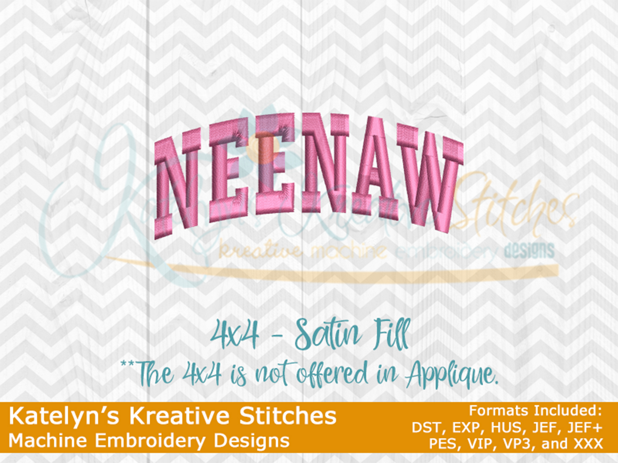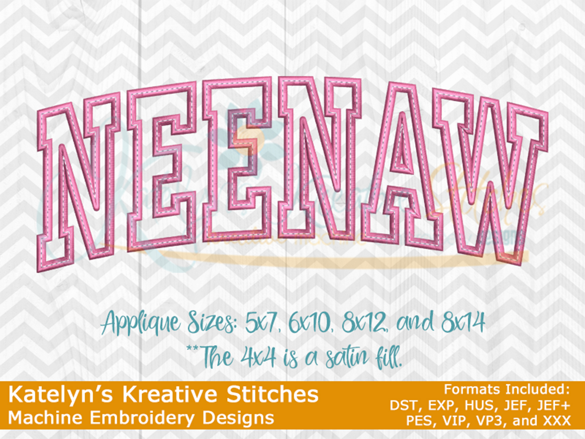 Our NeeNaw arched embroidery design will come in 5 sizes. The 5x7, 6x10, 8x12 and 8x14 will be applique. The smaller 4x4 size will be in a satin stitch. These will be great for sweatshirts and tees. The 4x4 size will be perfect for polo's too.