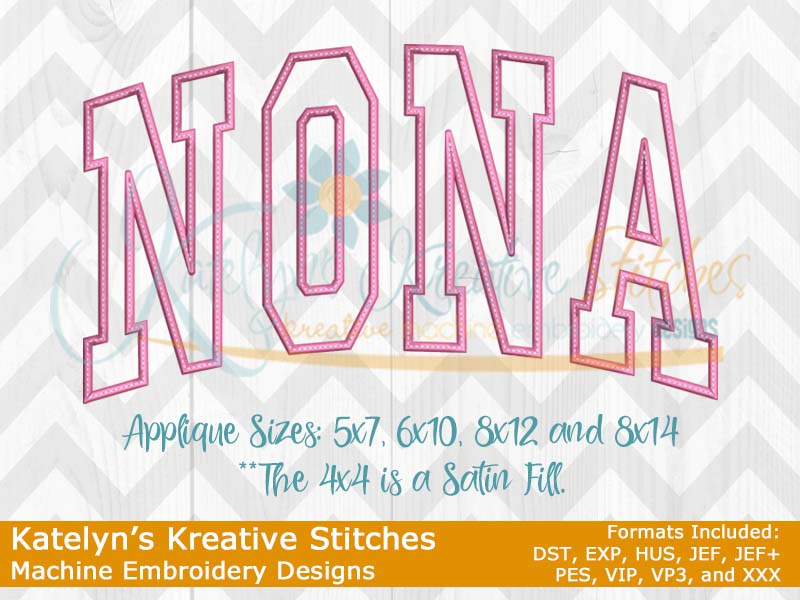 Our Arched designs will come in 5 sizes. The 5x7, 6x10, 8x12 and 8x14 will be applique. The smaller 4x4 size will be in a satin stitch. These will be great for sweatshirts and tees. The 4x4 size will be perfect for polo's too.