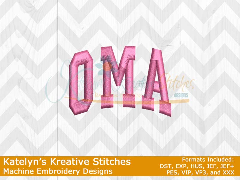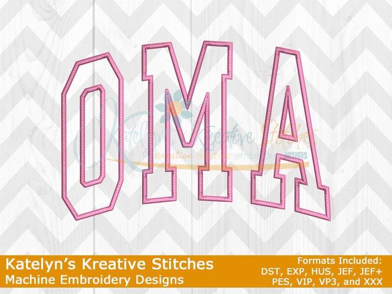 Our Oma arched embroidery design will come in 5 sizes. The 5x7, 6x10, 8x12 and 8x14 will be applique. The smaller 4x4 size will be in a satin stitch. These will be great for sweatshirts and tees. The 4x4 size will be perfect for polo's too.