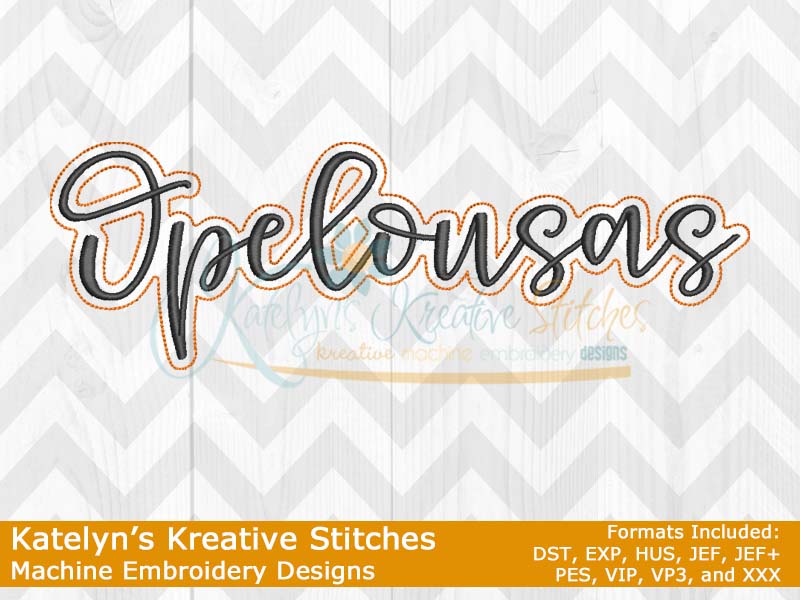 Our Opelousas Script will come in 5 sizes for a quick and simple stitch out. They will fit the 4x4, 5x7, 6x10, 8x12 and 8x14 hoop sizes. These will be great for tees, sweatshirts, hoodies, blankets, bags and much more. The 4x4 size will be perfect for polo's. Please refer to your .pdf files for design layout and color chart. Each step is labeled on the .pdf files.