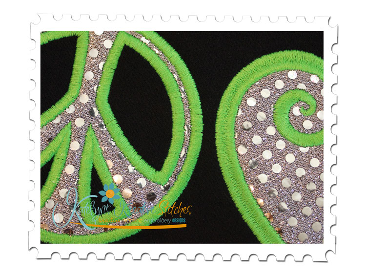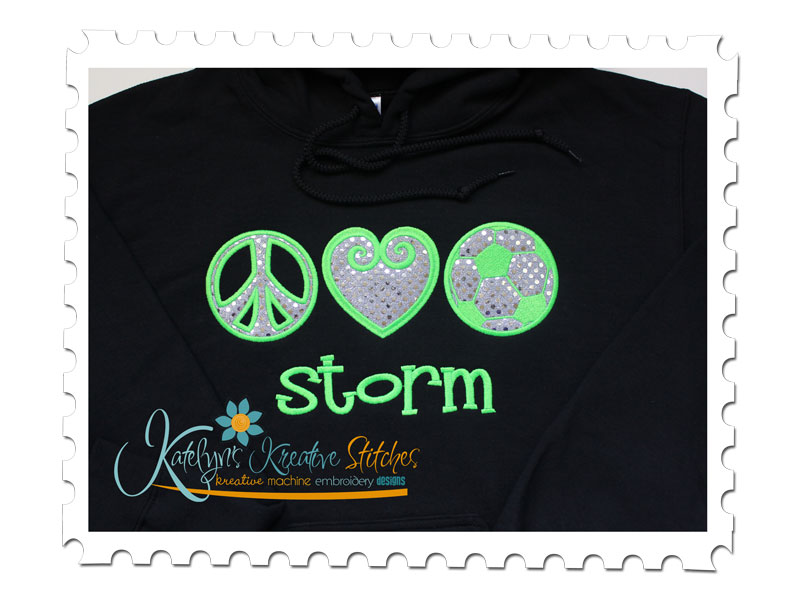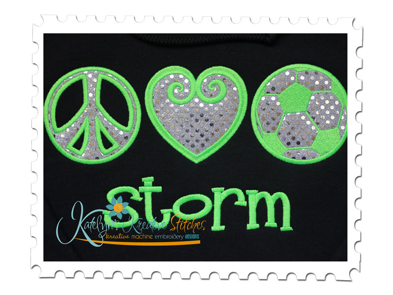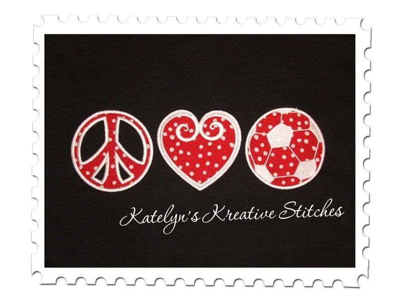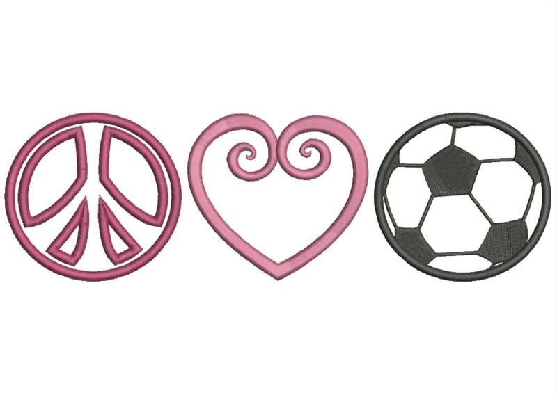 We all need a little more Peace, Love and Soccer in our Lives. This MUST HAVE design will be a fantastic addition for any Sports Team. Perfect for Tees, Sweatshirts, Blankets, Bags, etc. This applique design will be in a Satin Stitch for the 5x7, 6x10 and 11x7 hoop sizes.