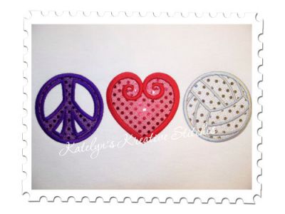 We all need a little more Peace, Love and Volleyball in our Lives.  This MUST HAVE design will be a fantastic addition for any Sports Team.  Perfect for Tees, Sweatshirts, Blankets, Bags, etc.  This applique design will be in a Satin Stitch for the 5x7, 6x10 and 11x7 hoop sizes.