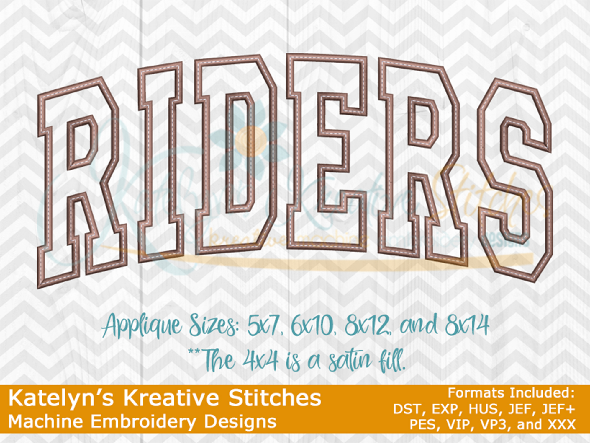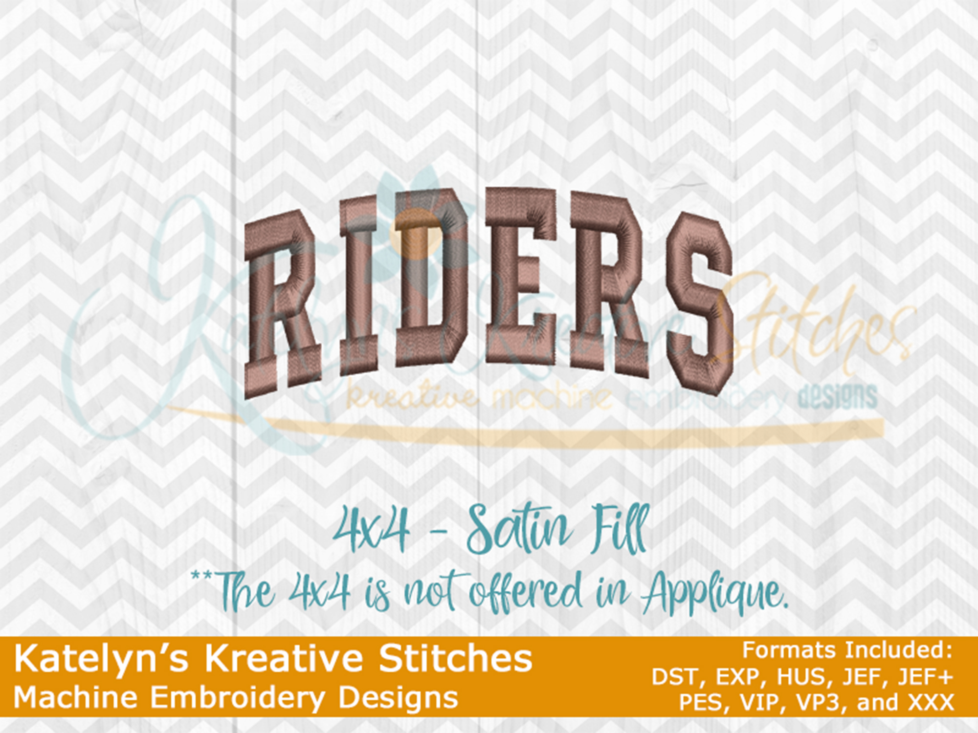 Our Riders arched embroidery design will come in 5 sizes.  The 5x7, 6x10, 8x12 and 8x14 will be applique.  The smaller 4x4 size will be in a satin stitch.  These will be great for school sweatshirts and tees.  The 4x4 size will be perfect for polo's too.