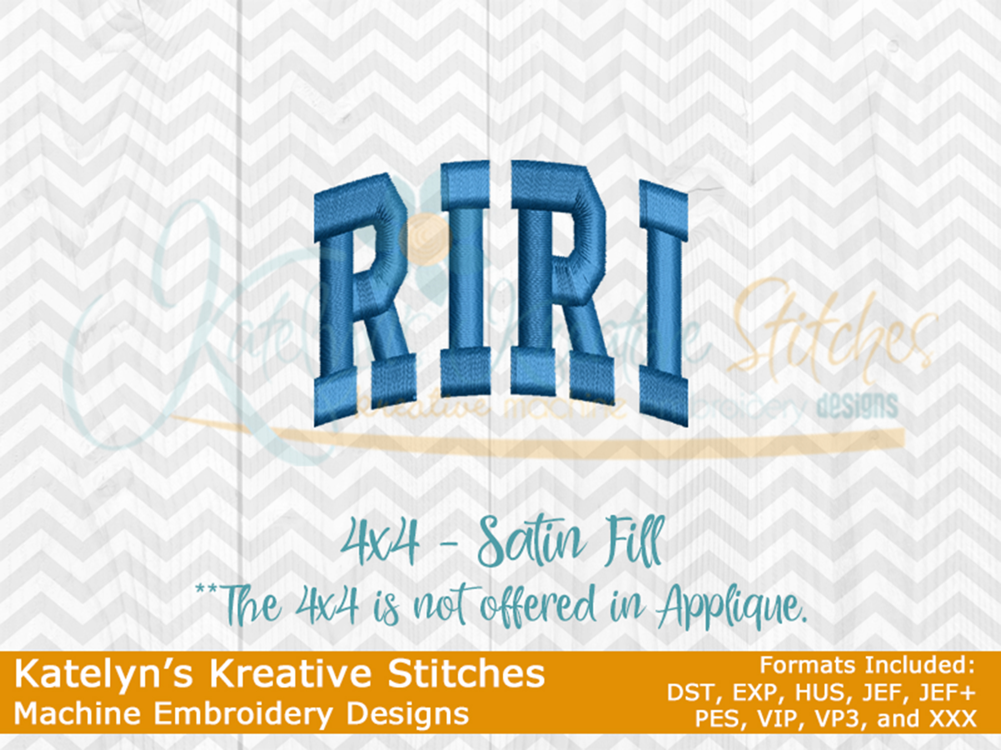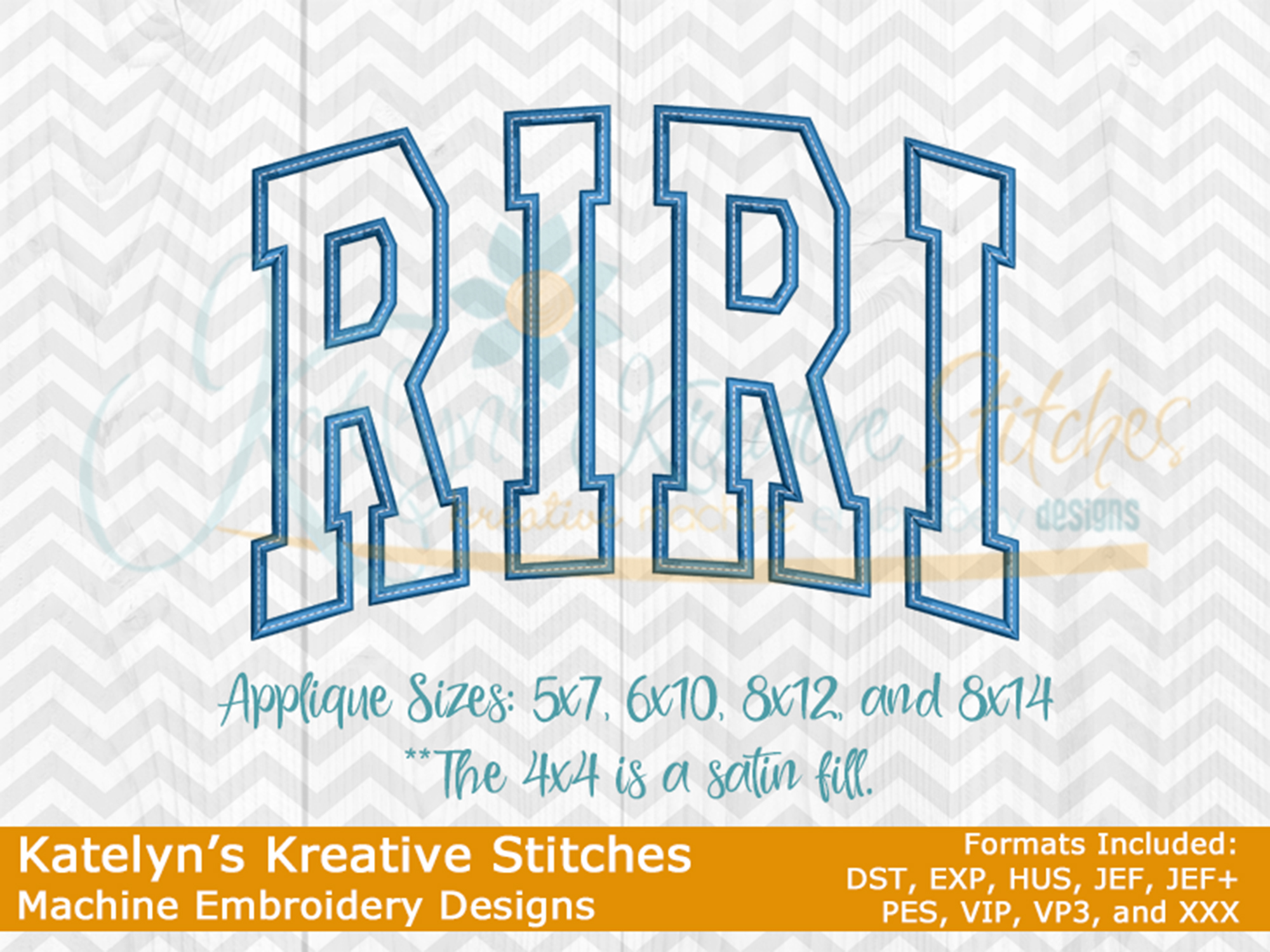 Our RIRI arched embroidery design will come in 5 sizes. The 5x7, 6x10, 8x12 and 8x14 will be applique. The smaller 4x4 size will be in a satin stitch. These will be great for sweatshirts and tees. The 4x4 size will be perfect for polo's too.
