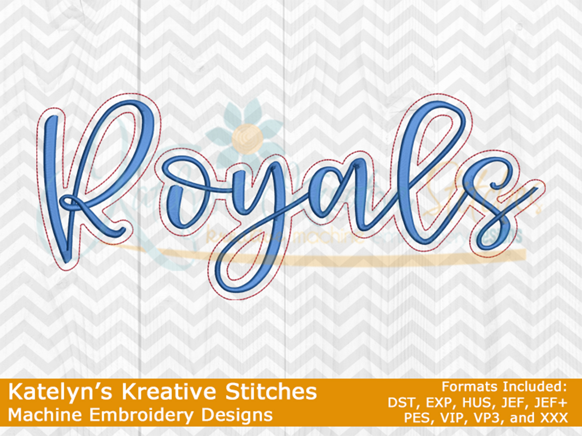 Our Royals Script will come in 5 sizes for a quick and simple stitch out.  They will fit the 4x4, 5x7, 6x10, 8x12 and 8x14 hoop sizes.  These will be great for school tees, sweatshirts, hoodies, blankets, bags and much more. The 4x4 size will be perfect for polo's. Please refer to your .pdf files for design layout and color chart. Each step is labeled on the .pdf files.
