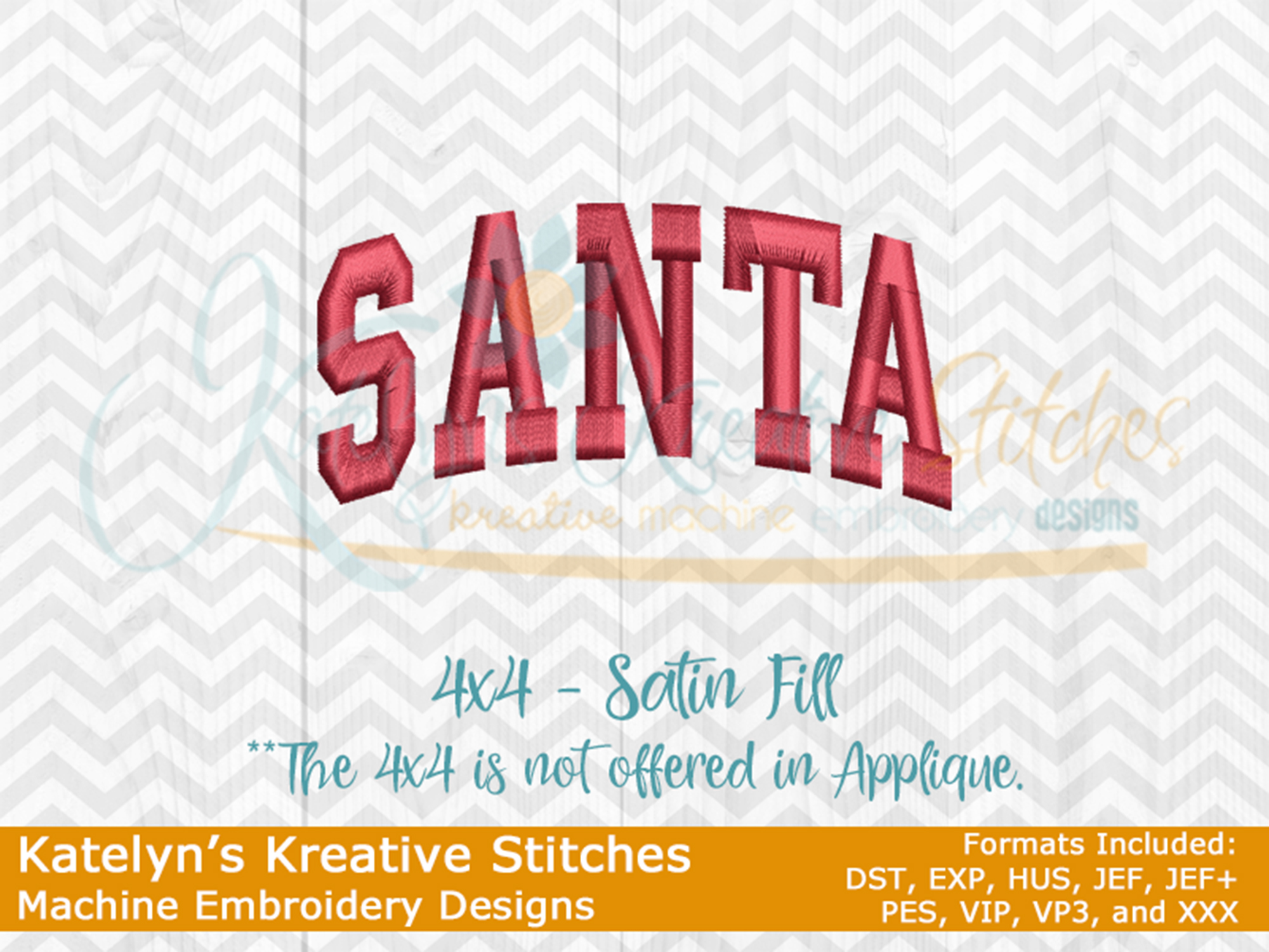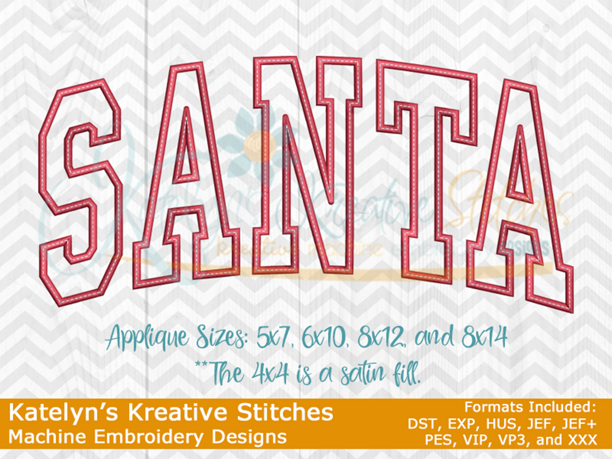 Our Santa arched embroidery design will come in 5 sizes. The 5x7, 6x10, 8x12 and 8x14 will be applique. The smaller 4x4 size will be in a satin stitch. These will be great for fall and winter sweatshirts. The 4x4 size will be perfect for the pocket area of a sweatshirt or jacket.