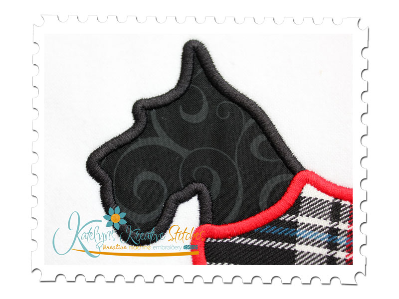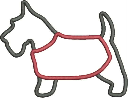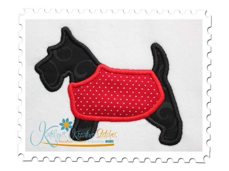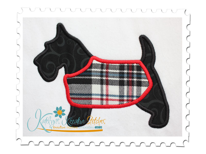 Our adorable Scottie applique is all ready for winter. He's wearing his cozy coat. This design is perfect for Sweatshirts, Totes or Quilts. He will fit the 4x4, 5x7 and 6x10 hoop sizes. You can also add a red bow for a little girl.