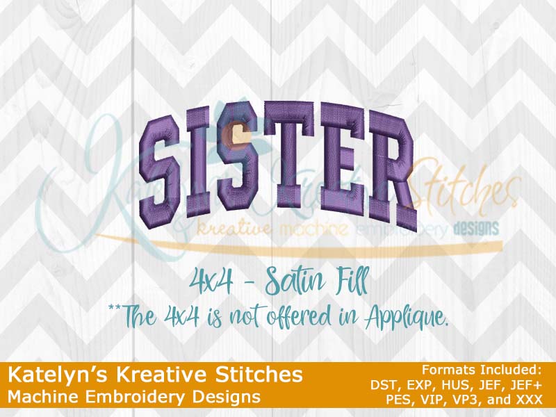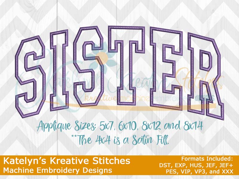 Our Sister arched embroidery design will come in 5 sizes. The 5x7, 6x10, 8x12 and 8x14 will be applique. The smaller 4x4 size will be in a satin stitch. These will be great for sweatshirts and tees. The 4x4 size will be perfect for polo's too.