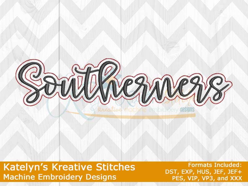 Our Southerners Script will come in 5 sizes for a quick and simple stitch out. They will fit the 4x4, 5x7, 6x10, 8x12 and 8x14 hoop sizes. These will be great for school tees, sweatshirts, hoodies, blankets, bags and much more. The 4x4 size will be perfect for polo's. Please refer to your .pdf files for design layout and color chart. Each step is labeled on the .pdf files.